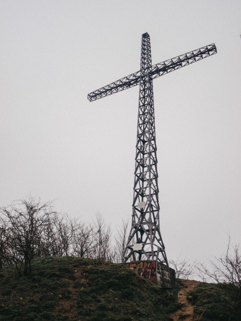 Desde su cumbre, disfrutamos de unas incomparables vistas sobre la capital alavesa, así como de las extensiones que poco a poco van desperezándose hacia el Sur. Corona la cumbre una cruz, heredera de una anterior colocada allí en septiembre de 1946. Esta cruz original, estaba fabricada en madera y contaba con unos 3 metros de altura. Sus promotores fueron montañeros que a posteriori, formarían la sociedad excursionista Manuel de Iradier. A los pies de la cruz, se colocó un buzón, el primero en esta montaña. La cruz que vemos en la actualidad, tiene un curioso origen, que nos remonta hasta el año 1934. Por esa época, Francisco Hernández Peña, médico de Vitoria, crea la primera emisora de radio alavesa, que llamó EAJ-62, y que emitía desde una casa en la calle Prudencio María Verástegui. Esta radio fue el origen de la actual Radio Vitoria. Para emitir creo una antena que colocó entre las calles Libertad, Los Herrán y Francia. Cuando el doctor no pudo seguir con su labor, vendió la emisora y donó la antena. Con ella y otros materiales, se construyó la actual cruz que vemos en la cima, que se colocó allí en 1950.