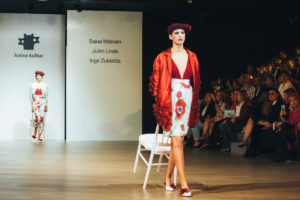 El viernes fue el turno para los 6 diseñadores residentes en el espacio que Kutxa Kultur tiene en Tabakalera. Goiuri Unanue presentó 8 diseños donde pudimos ver conjuntos de dos piezas con falda y pantalón en tonos granates, rosa y verde. Me encantó el toque de la boina para dar estilo francés a lo looks. Pispiripispo con su línea de ropa infantil, cómoda, de líneas rectas y estampados originales sacó la sonrisa de todos los presentes. Miguel Angel Lima mostró la propuesta arriesgada de la noche; un manifiesto de emociones entre el dolor y el placer. El vestido gris de su colección es uno de mis favoritos.