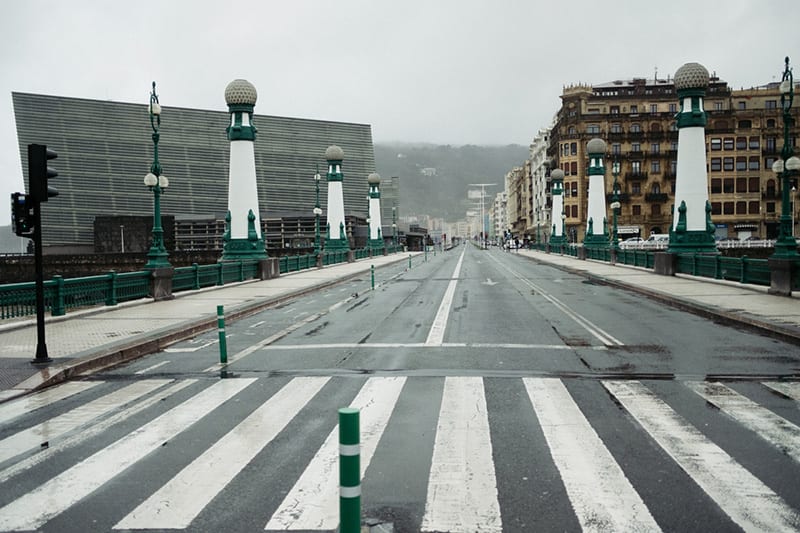 Un lunes cualquiera al mediodía la lluvia no sería impedimento para el tránsito continuo en el Puente de la Zurriola. Sin embargo hoy ni los vecinos de Gros iban al Centro ni a la inversa. El Estado de Alarma que empezó a hacerse visible ayer tímidamente deja hoy en Donostia esta imagen que empezará a ser frecuente estos días.