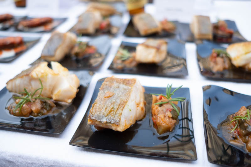 Taco de bacalao acompañado de una sanfaina de inspiración local con berenjena, calabacín, cebolla, pimiento rojo y verde, tomate, aceite, perejil, ajo y cayena.