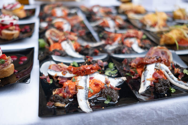 Reinvención del tradicional pintxo de boquerón en vinagre: crema de pimiento asado con comino, nuez y limón, tomate seco, jamón crujiente y tapenade de aceituna negra y sésamo.