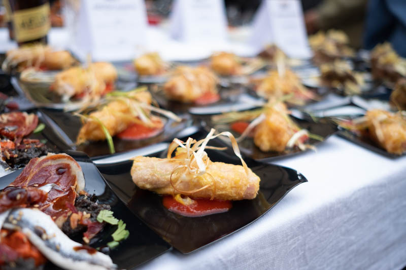 Espárrago autóctono rebozado envuelto en jamón york y queso Edam, con virutas de puerro y la tradicional salsa vasca de pimiento de Piquillo.