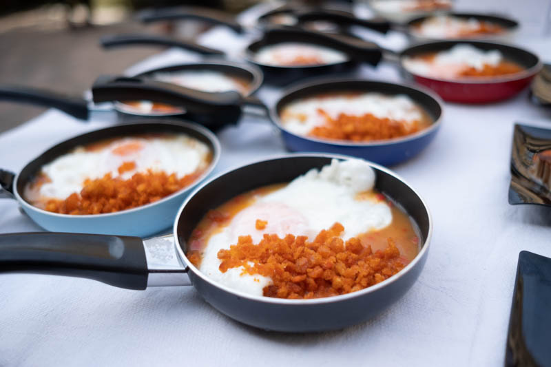 Original reinterpretación del plato favorito del gran chef vasco: huevo frito de caserío con piquillos confitados, Parmentier de patata, migas de pan y pimentón de la Vera.