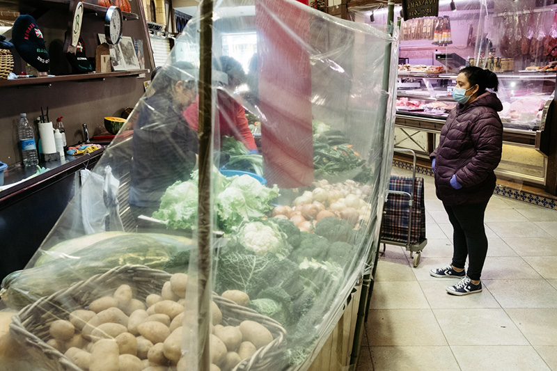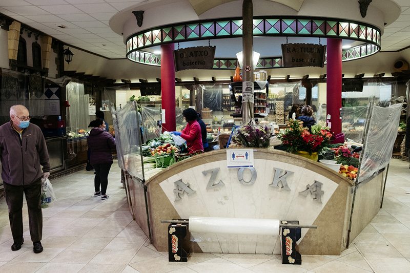 Ni las mascarillas, ni los guantes ni los llamativos plásticos que separan a vendedores y compradores en los mercados, como en el caso del de Gros, restan el valor que supone comprar el producto de casa a quien vive más cerca. Y de forma directa. En Donostia la opción de los mercados está viva con o sin crisis del coronavirus. Simplemente el mercado se adapta y se viste de plástico. Y a disfrutar del producto.