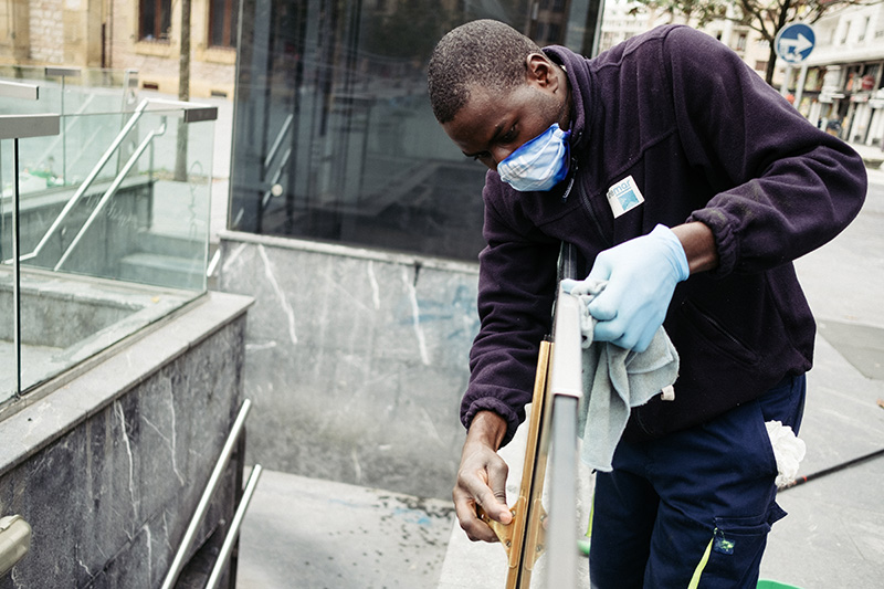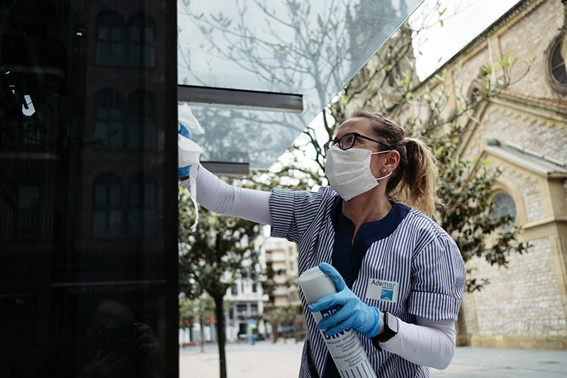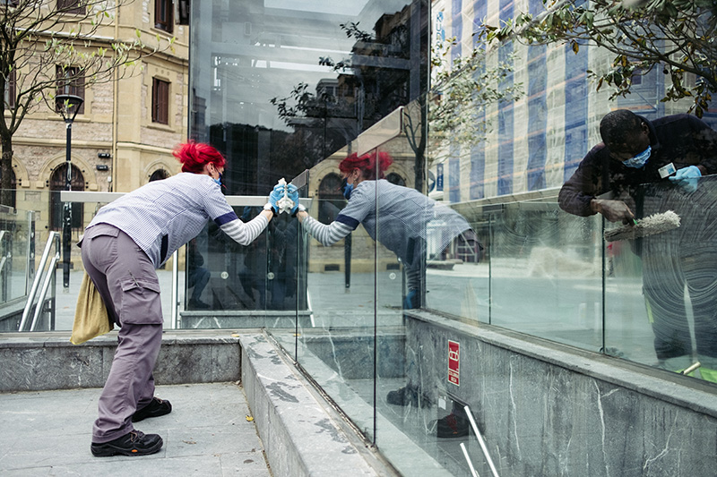 Nunca se le había sacado tanto brillo al mobiliario urbano. Nunca se había visto limpiar con tanto ahínco en Donostia. Esta mañana dejaban impoluto el acceso al parking de la plaza Cataluña y no es cuestión de imagen. De un tiempo a esta parte la palabra ‘higiene’ ha vuelto a sonar asociada a la salud en un binomio que creíamos completamente pegado a nuestra piel desde hace siglos. No es así. Los limpiadores limpian y lo hacen protegidos de la suciedad ilustrando perfectamente el temor social generado por el coronavirus. Contra la enfermedad, limpieza y más limpieza. Personal y de todo aquello que tocamos. Es nuestra principal arma. Y merecen un doble agradecimiento quienes limpian allá por donde pasamos.