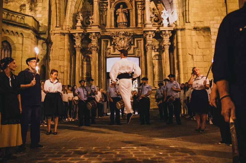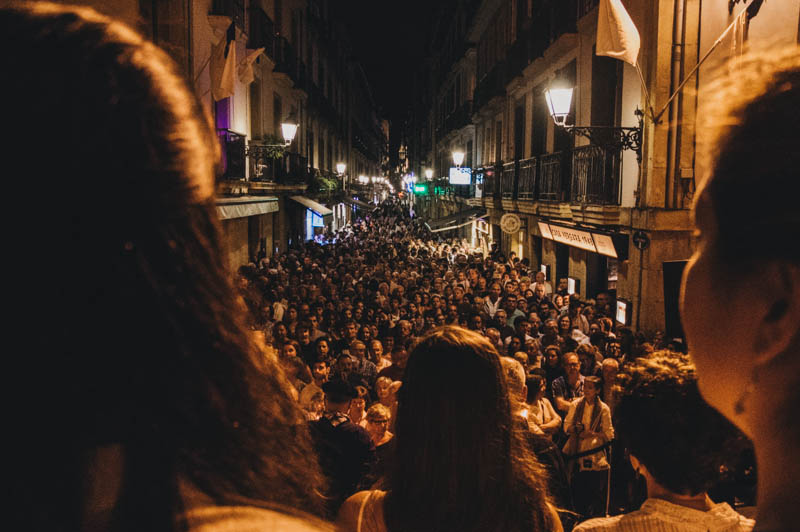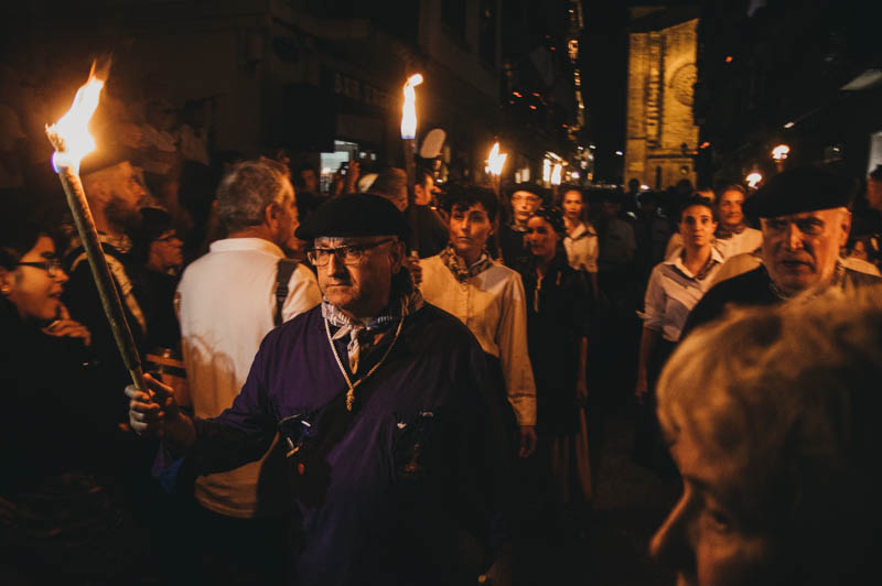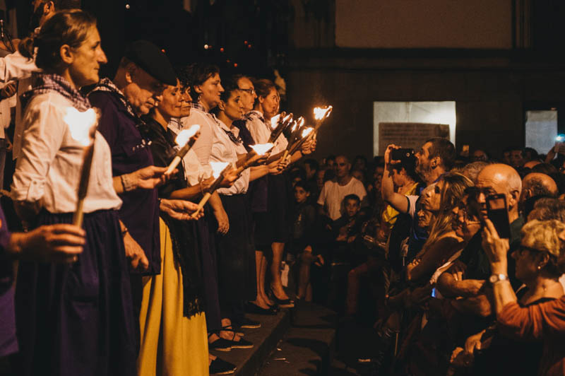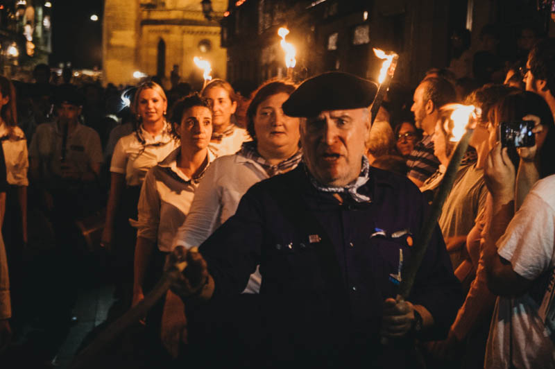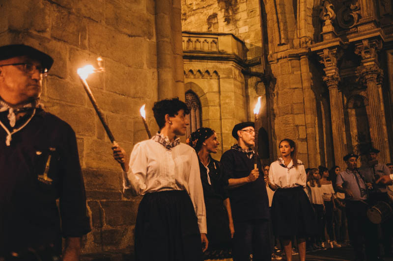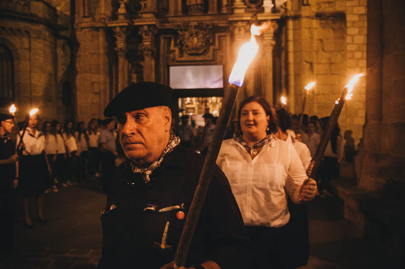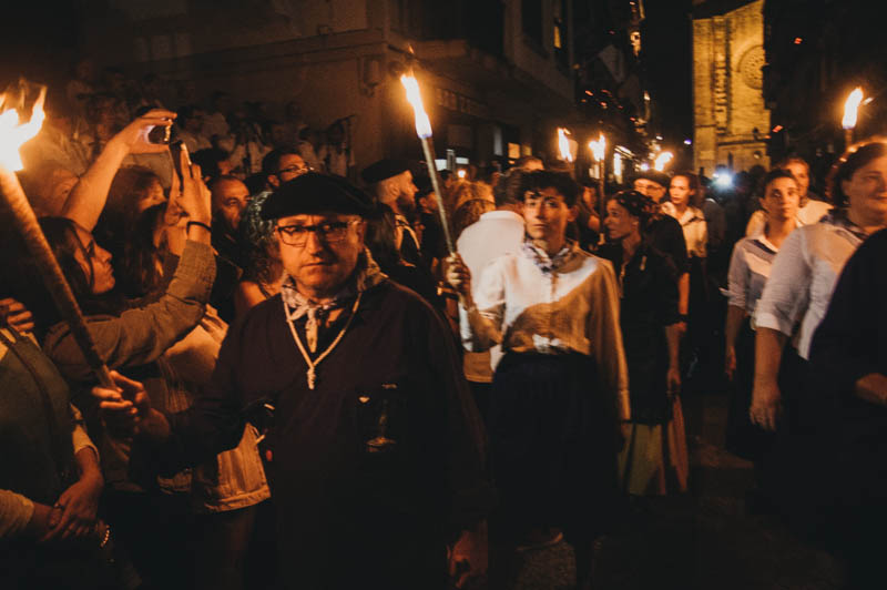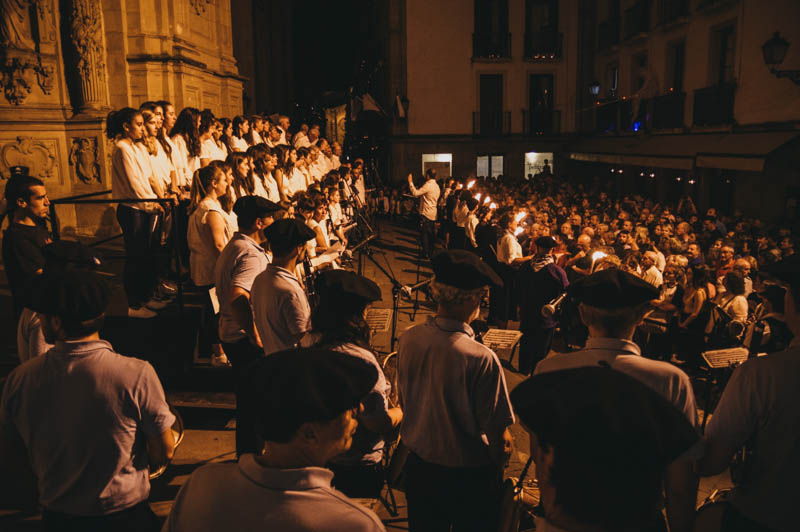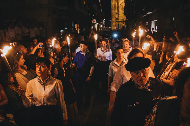 Como es tradición el apagón a las 21.30 horas ha sido la escena más solemne de la jornada con el paseo ceremonial a la luz de las antorchas desde el atrio de San Vicente, y la interpretación del primitivo Himno de San Sebastián hasta el de atrio de Santa María al son de la Marcha por los fallecidos el 31 de agosto.