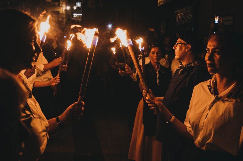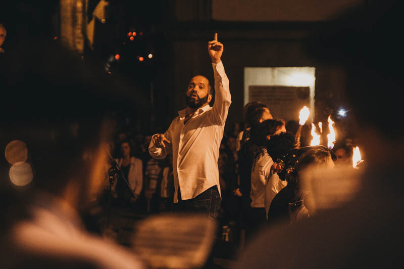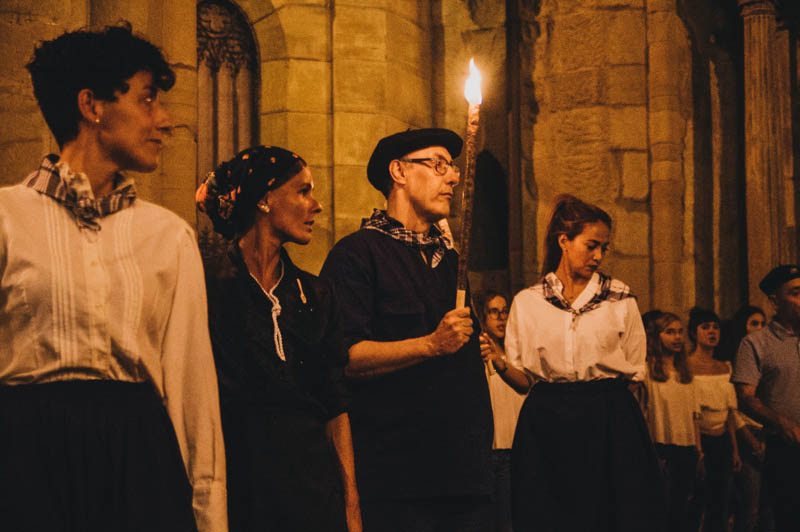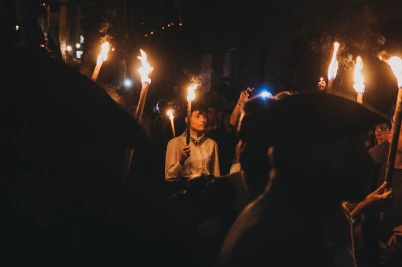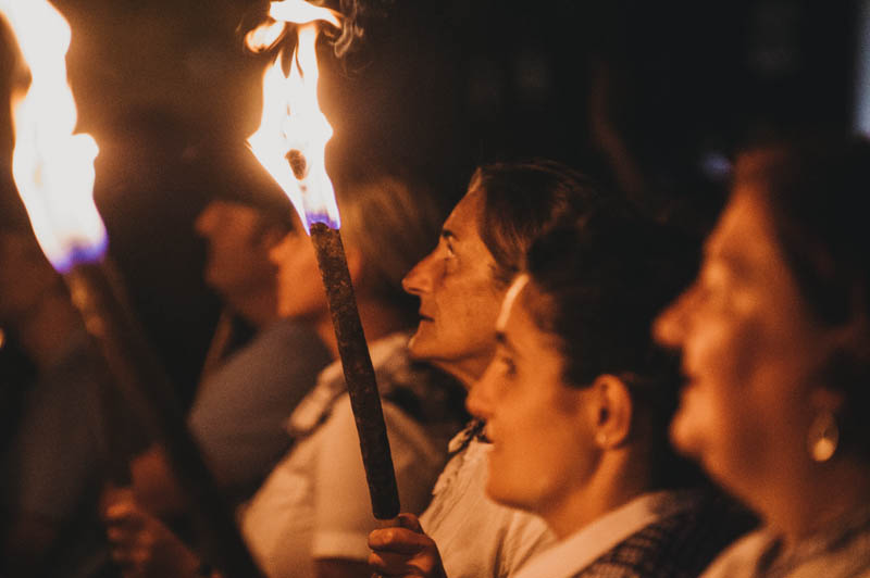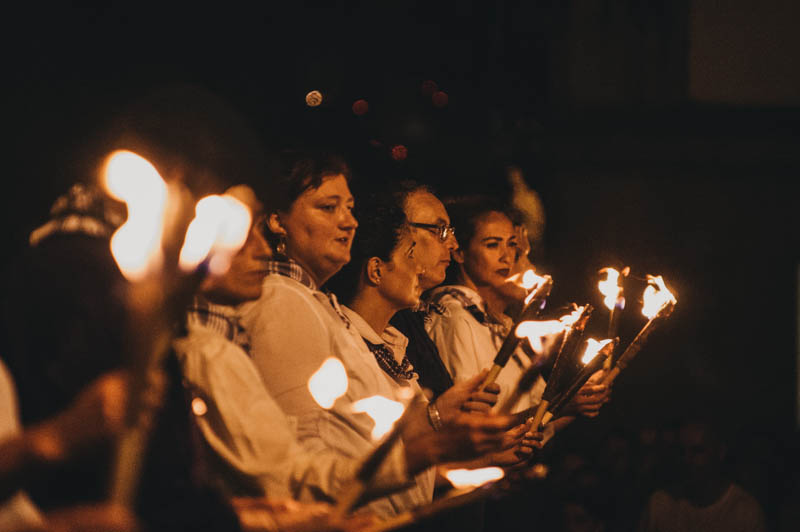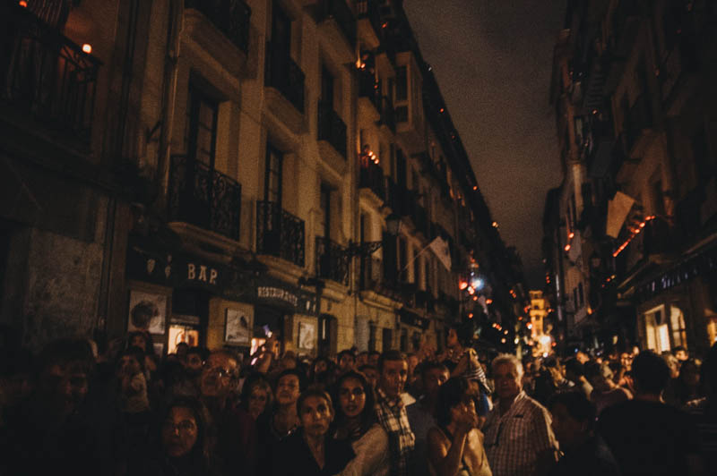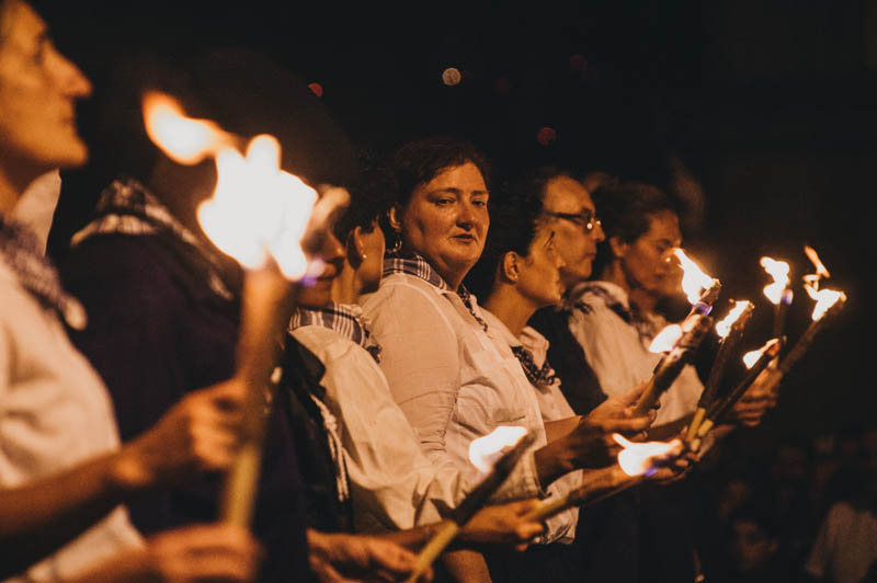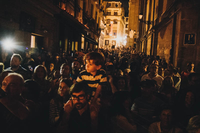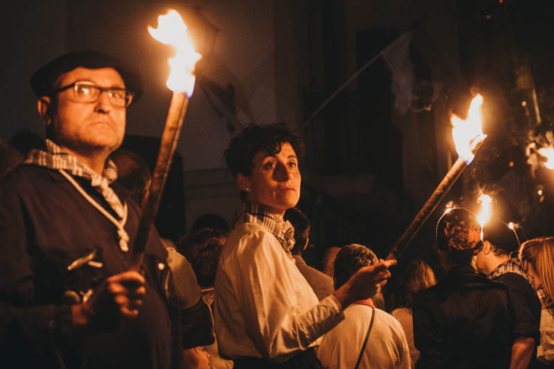Como es tradición el apagón a las 21.30 horas ha sido la escena más solemne de la jornada con el paseo ceremonial a la luz de las antorchas desde el atrio de San Vicente, y la interpretación del primitivo Himno de San Sebastián hasta el de atrio de Santa María al son de la Marcha por los fallecidos el 31 de agosto.