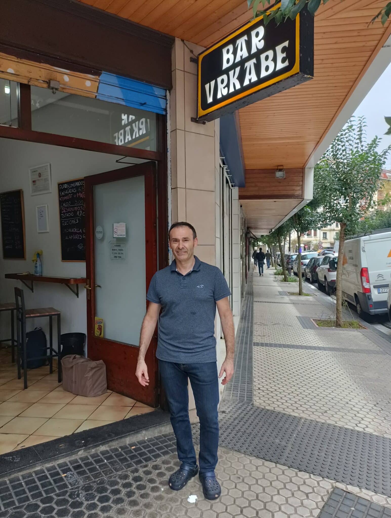 La comanda llega a la parte trasera donde Javier Domínguez (52 años) ejerce de “pinche ayudante de cocina”. El responsable de este establecimiento hostelero desde hace más de dos décadas es un hombre amable y cercano, el tipo de persona que entorna los ojos cuando sonríe. Primero empezó trabajando en la barra y con el tiempo se ha “reconvertido” echando una mano en la cocina, cuenta. El bar Urkabe lo abrió su suegro hace cuatro décadas en un guiño al monte oiartzuarra del mismo nombre.