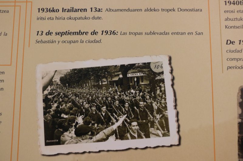 «Hoy se cumplen 80 años de la caída de la ciudad y, por tanto, de que se apagaran la democracia y la libertad. Por ello, el objetivo de la exposición ‘Oroimena Bizirik’ es recordar lo sucedido en la ciudad aquel verano, reconociendo a quienes padecieron aquel sufrimiento, y del mismo modo, dar una lección que nos servirá de cara al futuro para que la historia no se vuelva a repetir”. Así inauguró hoy el alcalde de Donosti, Eneko Goya, la exposición de la Casa de Cultura de Ayete, que podrá verse hasta el 27 de noviembre. Por la tarde también hubo actos en el Ayuntamiento en conmemoración de la entrada de las tropas franquistas en San Sebastián el 13 de septiembre del 36.