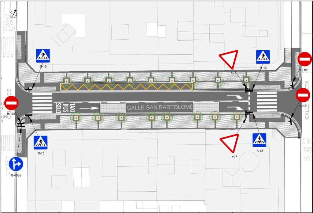 La solución adoptada se enmarca en la necesidad de restaurar y mejorar la funcionalidad de la calle. De este modo se pretende aprovechar esta intervención para la reordenación integral del espacio y la creación de un carril bus de dirección única, en consonancia con los planes de desarrollo urbano de la ciudad. Así, se construirá un segundo carril para turismos en dirección única, se habilitará un área para carga y descarga y se ampliarán de manera sustancial las aceras, para brindar más espacio a los peatones, con zonas de descanso y vegetación.