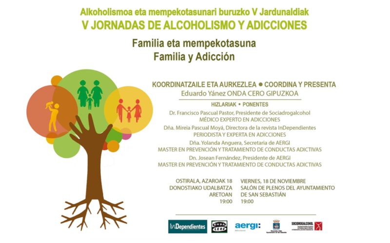 El Salón de Plenos del Ayuntamiento acogerá mañana viernes a las 19 horas las V Jornadas de Alcoholismo y Adicciones bajo el lema Familia y Adicción. Con entrada libre hasta completar aforo, el encuentro está organizado por la Asociación de Alcohólicos y Adictos en Rehabilitación de Gipuzkoa (AERGI).