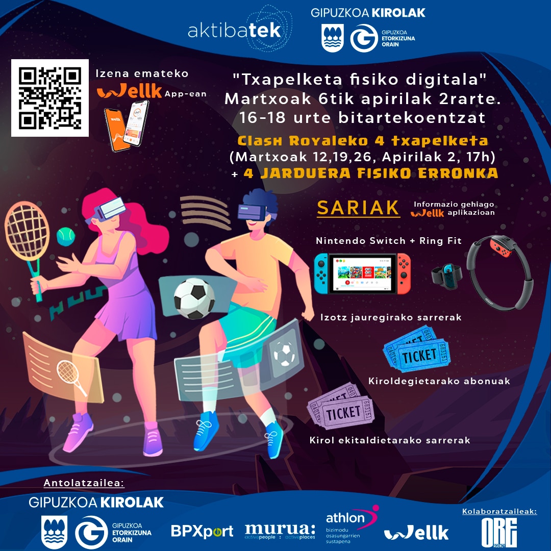 Todos los domingos, hasta el 2 de abril, se van a organizar campeonatos del videojuego Clash Royale con una particularidad: para clasificarse no bastará con ser competitivo únicamente en el videojuego propuesto, sino que habrá que incrementar la práctica de ejercicio físico con carácter regular. A lo largo de la semana, los jóvenes deberán cumplir unos retos de actividad física y conseguirán puntos por cada kilómetro que realicen caminando por acceder a los polideportivos de Orio-Tolosa-Irun-Ordizia-Legazpia- Aretxabaleta.