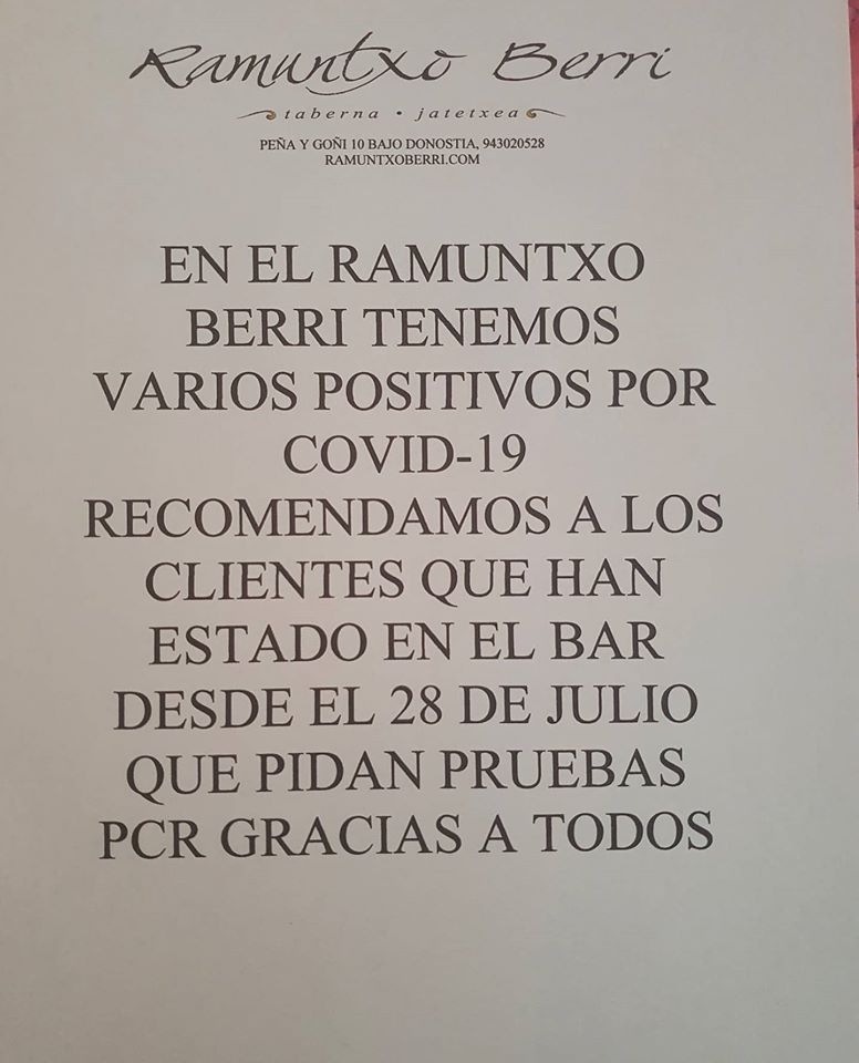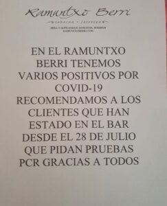 Osakidetza avisa de que las personas que entre los días 26 de julio y 3 de agosto hayan estado en el bar Ramuntxo Berri de Gros soliciten cita previa para la realización de una PCR.
