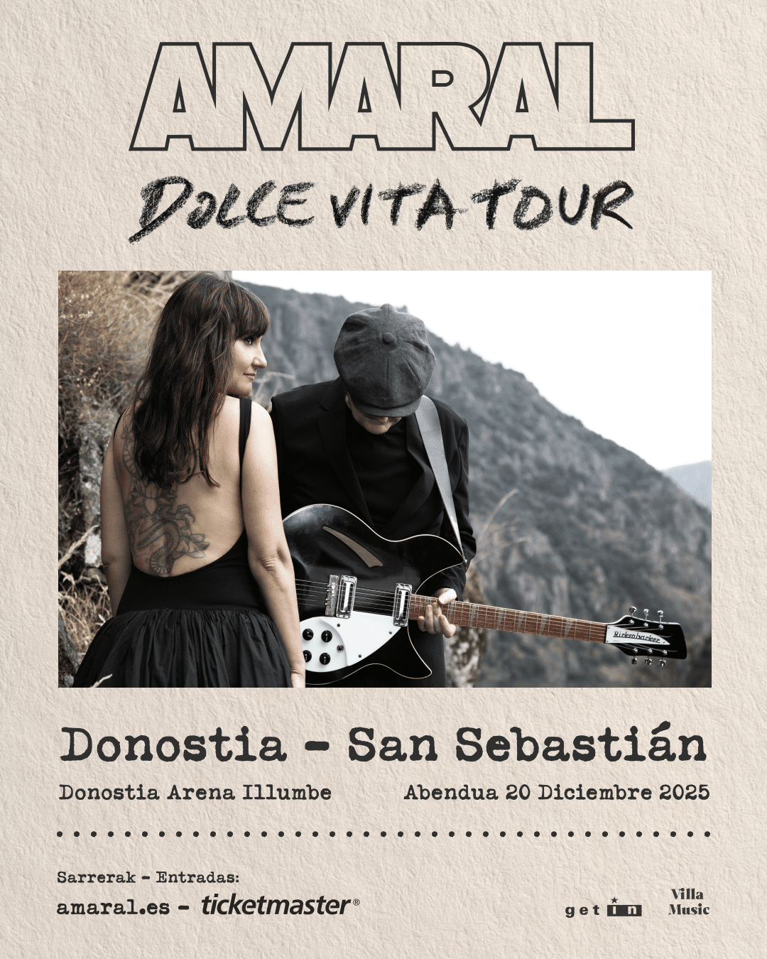 Amaral presentará su nuevo trabajo ‘Dolce vita’ con una gira que, tras pasar entre otras ciudades por Bilbao (10 de mayo) y Pamplona (24 de mayo), llegará a Donostia el 20 de diciembre. Las entradas para esta cita en Illunbe saldrán a la venta este viernes 28 de febrero a las 10 horas en amaral.es.