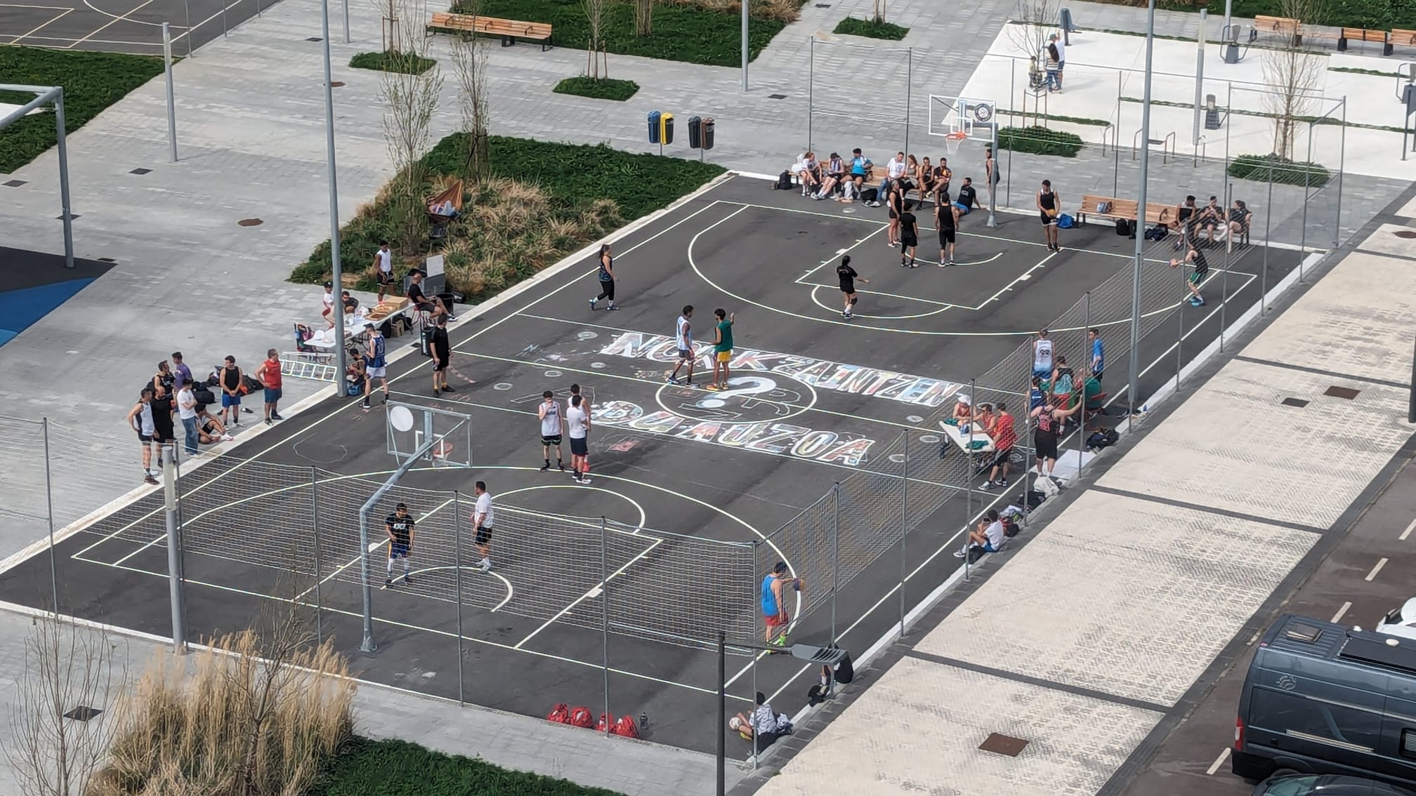 «El año pasado, después de tantos años, finalizó en Txomin la obra de la plaza Arteleku con la construcción de la nueva pista deportiva de baloncesto. Esta instalación se ha conseguido a partir de las aportaciones y luchas cotidianas de los vecinos para conseguir un espacio abierto que dé vida a las calles del barrio», nos explican desde Lanberri.