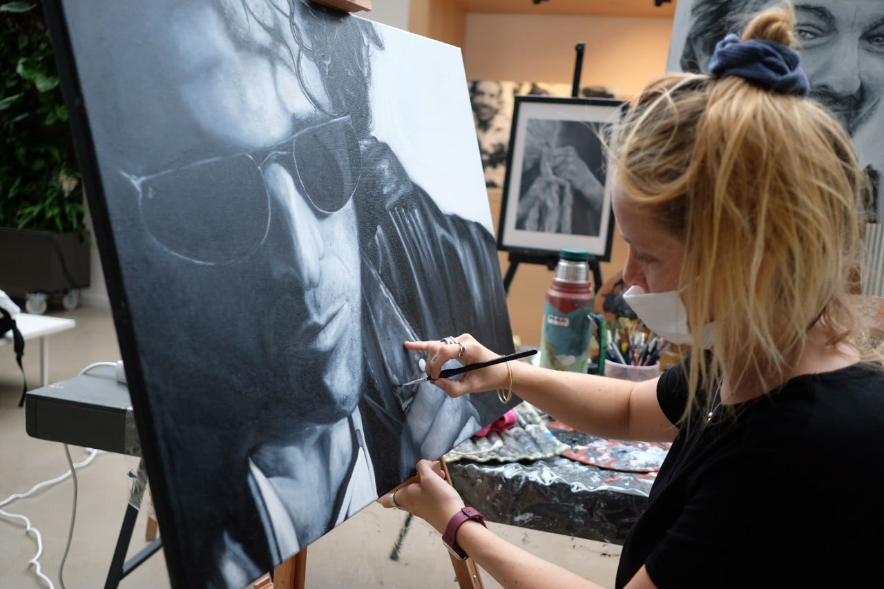 Contactó con Kutxa Kultur cuando le hablaron del programa Artistaren Txokoa y en la entidad ya conocían los murales que la joven había hecho en Donostia. Así que bastó con poner fecha y ha sido este mes de julio cuando Van der Heyden se ha dedicado íntegramente al retrato del ‘Salmón’, que la artista incluso ha terminado un poco antes de que acabe el mes. Cabe recordar que con esta iniciativa Kutxa Kultur invita a determinados creadores a trasladarse temporalmente a sus instalaciones.