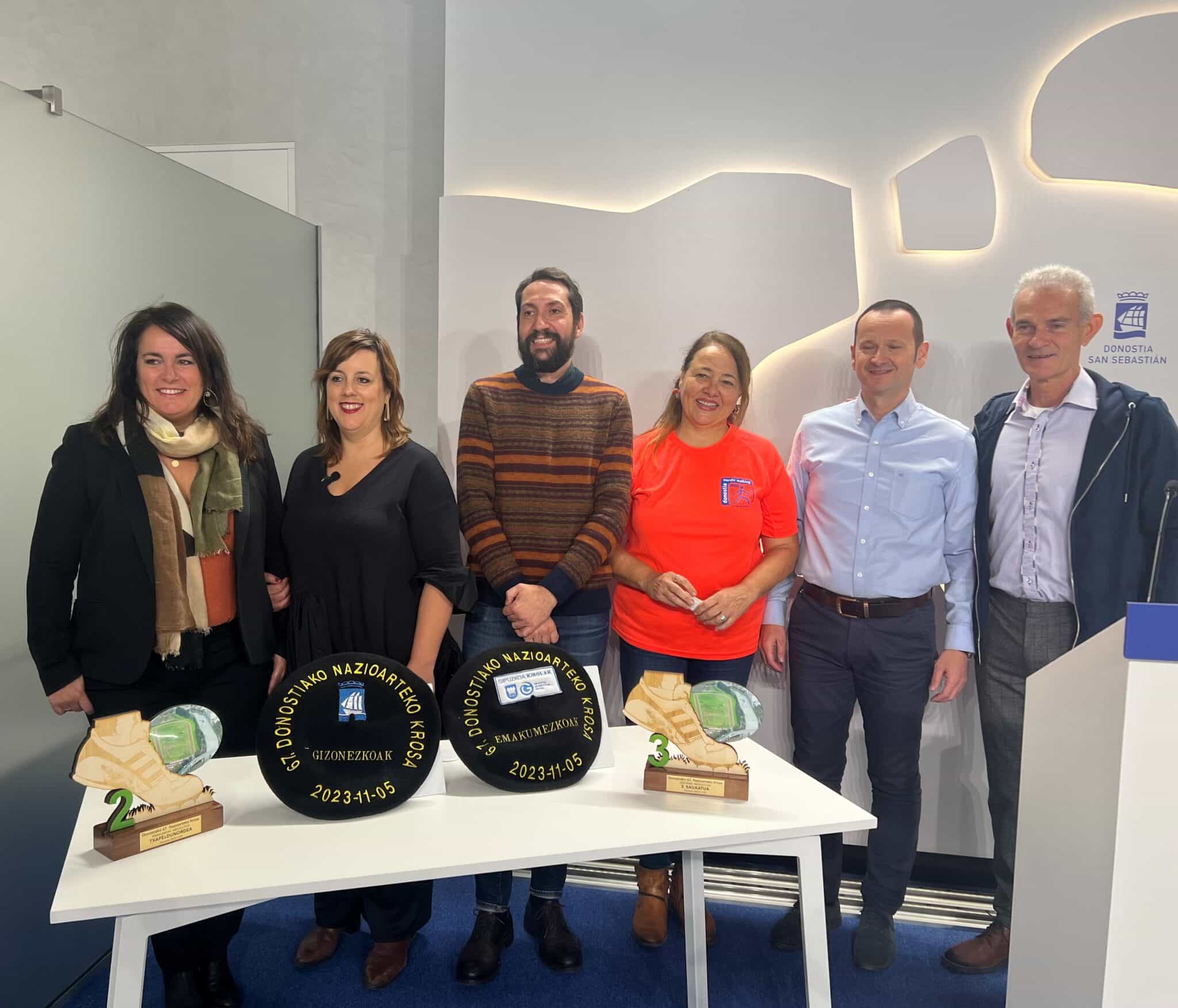 En la presentación del cross participaron Marta Pastor, directora de Deportes; Goizane Álvarez, diputada de Deportes; Iñaki Gabarain, concejal de Deportes; Ramon Goikoetxea, presidente de la Federación Guipuzcoana de Atletismo; Olatz Egües, presidenta de Nordic Walking Donostia Urban, y Anartz Arrieta, responsable de Laboral kutxa.