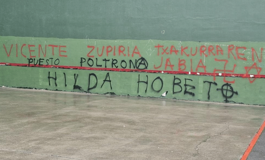 ‘Ertzaintza exterminio’, ‘Tiro en la boka’ y ‘Vicente Zupiria, dueño de los perros, mejor muerto’ son algunas de las frases que se pueden leer en las paredes del frontón, realizadas con pintura roja y negra, unas en castellano y otras en euskera -algunas con faltas- y con dibujos de dianas en el lugar de las letras O. Junto a una de ellas, hay además una esvástica y una estrella de David.