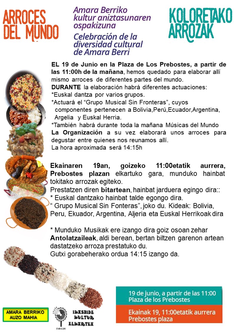 Dentro de su programa de fiestas, que se desarrollarán este fin de semana en Amara Berri (programa completo, aquí), este domingo a las 11 horas comenzará en la plaza de los Prebostes un encuentro original ligado a la importante presencia de vecinos llegados desde tantas culturas y utilizando como elemento central el arroz.