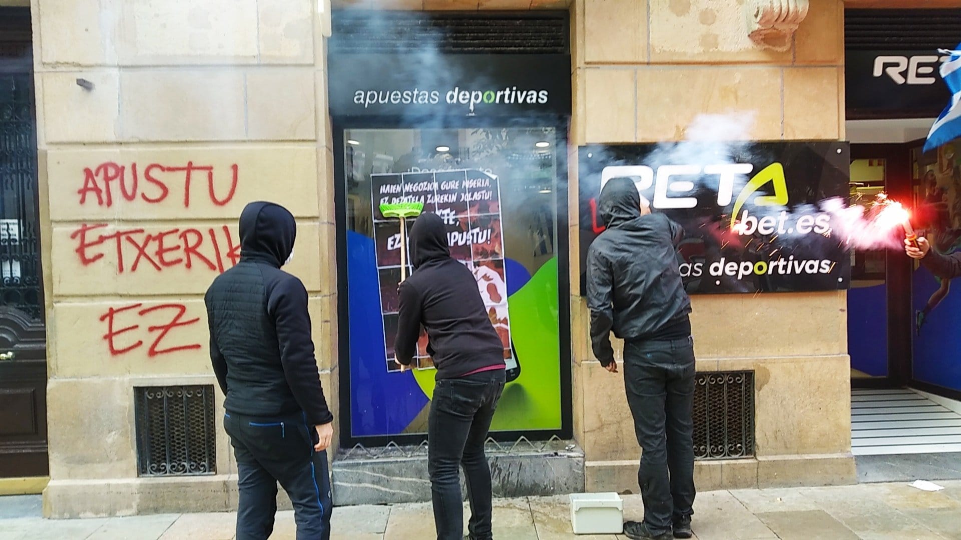 Alde Zaharreko Gazte Asanblada ha hecho público en las redes el atentado al local de una casa de apuestas ubicada en la Parte Vieja donostiarra. El colectivo insta a los jóvenes a no apostar y expresa: «Su negocio, nuestra miseria».