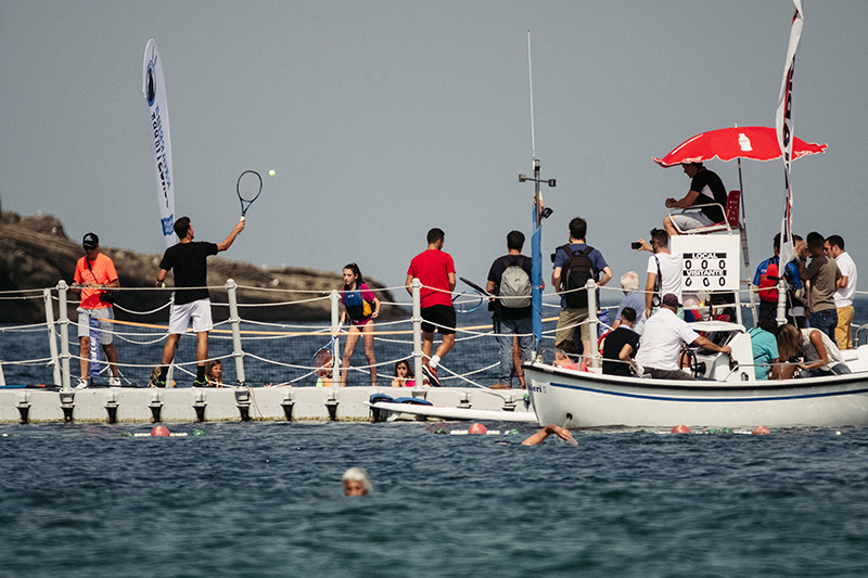 Sobre una plataforma en la Bahía de la Concha ha tenido lugar hoy una exhibición de tenis en el contexto
