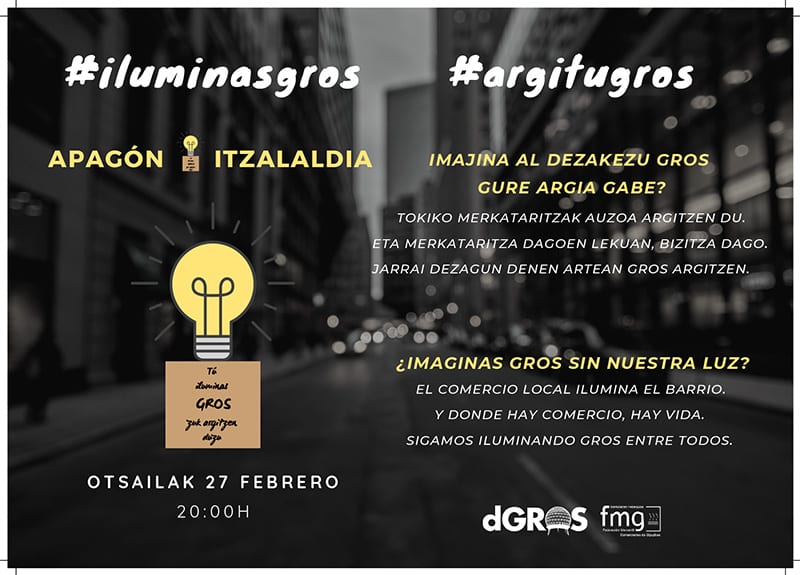 Bihar Groseko saltokiek beren erakusleihoak itzaliko dituzte, Udalari arreta dei bat egiteko, zeini eskatu baitzaio inguruko argiztapena hobetzeko. «Argitu Gros/