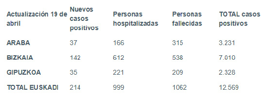 Son 214 los nuevos positivos confirmados en Euskadi, con lo que la cifra de personas contagiadas es de 12.569. De estas personas 999 se encuentran ingresadas en los hospitales. En Gipuzkoa el número de positivos es de 2.328 con 221 personas hospitalizadas. Y los fallecidos son 209. El dato positivo: en la jornada de ayer se realizaron un total de 3.481 test, la cifra más elevada realizada hasta ahora, y de ellos únicamente el 5% dio positivo.