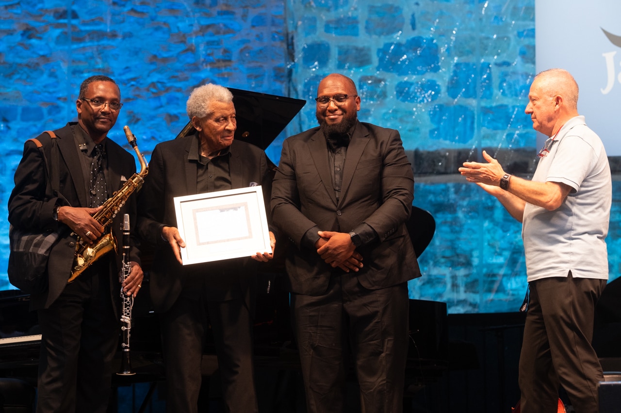 Durante esta tercera jornada del festival donostiarra el pianista japonés Yosuke Yamashita (Tokio 1942) ha recibido el premio Donostiako Jazzaldia 2023, un galardón que compartirá con el trompetista Enrico Rava y Abdullah Ibrahim, el músico sudafricano que protagoniza esta noche la primera parte de la velada en la plaza de la Trinidad.