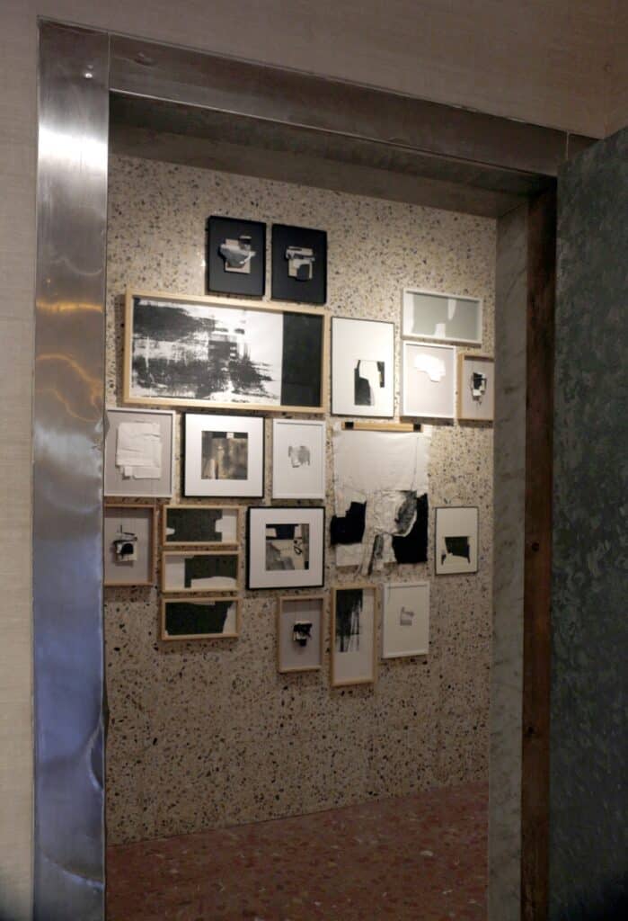 La muestra se compone de grabados, collages, esculturas blandas y colgantes, nos indica, mientras observamos a través de una ventana abierta en la pared de la antigua nevera una de sus obras, una escultura elaborada «con retales de las sobras de nuestros respectivos trabajos».