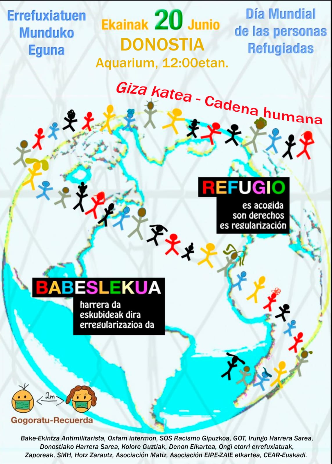 Este sábado con motivo de la celebración del día Mundial de las Personas Refugiadas, diferentes asociaciones de Donostia han organizado una cadena humana que dará comienzo a las 12 horas en el Aquarium de San Sebastián. Para acudir a la cita recuerdan el uso obligatorio de mascarilla y mantener los 2 metros de distancia entre las personas. Con el lema «Refugio es acogida, derechos, regularización», los convocantes animan a la ciudadanía a participar.