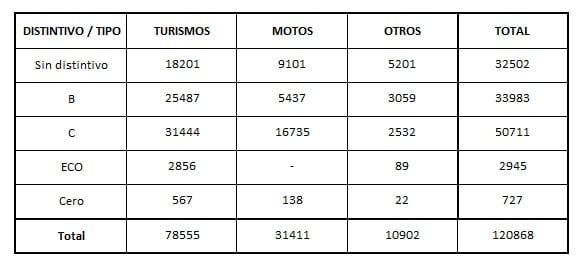 El dato total de vehículos matriculados en Donostia en 2022 es de 120.868. De estos 78.555 eran turismos (64,9%) y 31.411 motos (25,9%). Los distintivos con que cuentan se ven en la siguiente tabla. Más sobre la Zona de Bajas Emisiones, aquí.