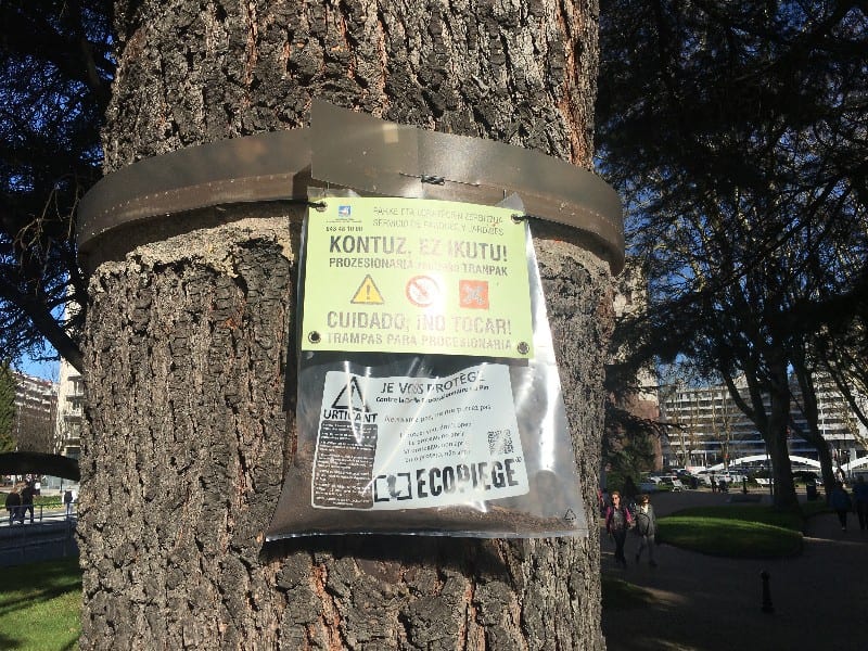 Estos días se aprecia en el tronco de diferentes árboles unas bolsas “trampa” para atrapar a este lepidóptero defoliador que se alimenta de las hojas de diferentes especies arbóreas. “El sistema consiste en crear una especie de anillo en el tronco de los árboles que dirige a la procesionaria a una bolsa donde puede ser recogida y retirada, evitando así que pase a otros árboles e incluso que pueda causar problemas de salud en personas y animales, fundamentalmente perros a los que puede causar incluso la muerte mediante sus pelos urticantes”, ha explicado la concejala de Espacios Públicos, la socialista Marisol Garmendia.