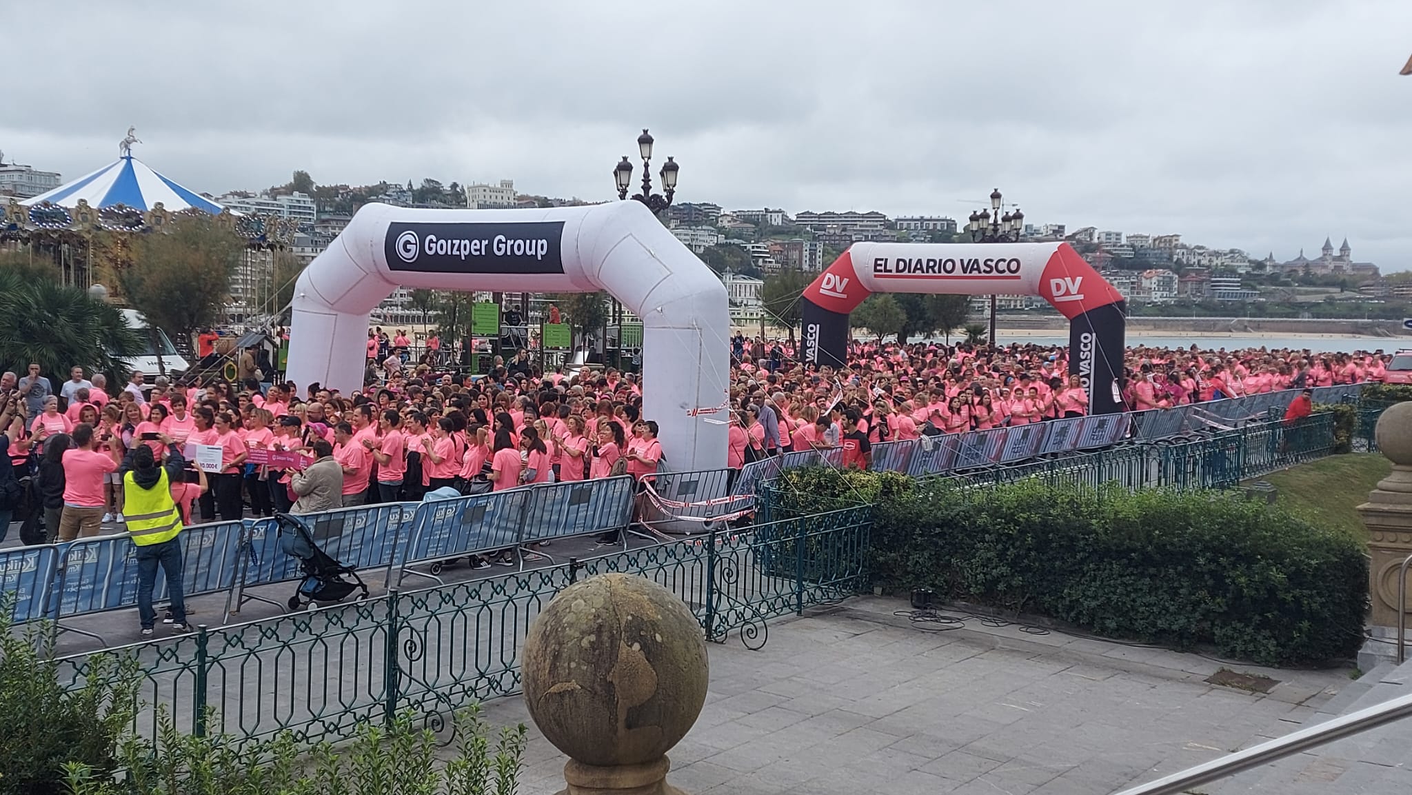 Antes de iniciar la marcha, la responsable de la asociación Garbiñe Aramendi hizo entrega del cheque de 30.000 euros, procedentes de las donaciones e inscripciones, a la directora científica del Instituto de investigación Biodonostia, Itziar Bergara.