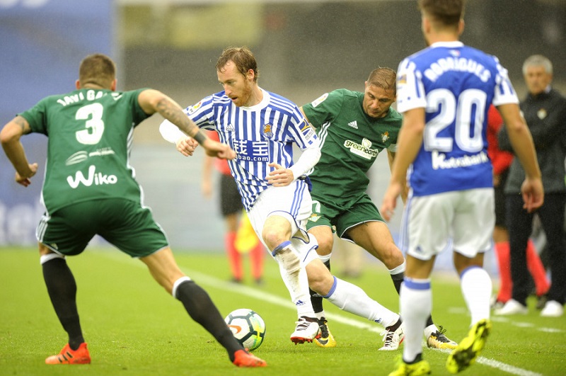 La intensa lluvia que ha marcado el encuentro no ha restado ni un ápice de emoción a un Real Sociedad-Betis