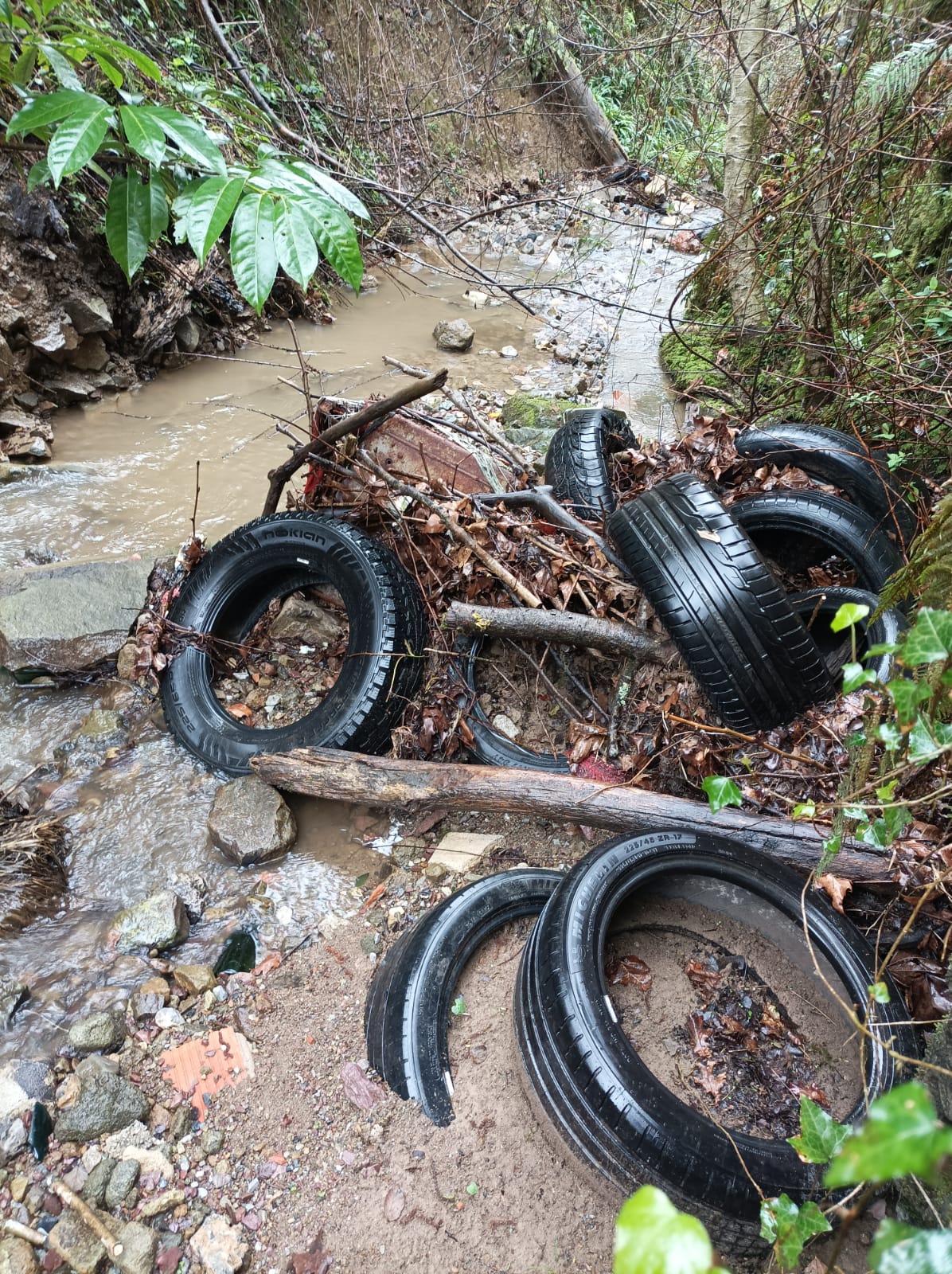 Eguzki denuncia el vertido, pide responsabilidades y advierte de que las intensas lluvias de hace unos días han arrastrado las ruedas