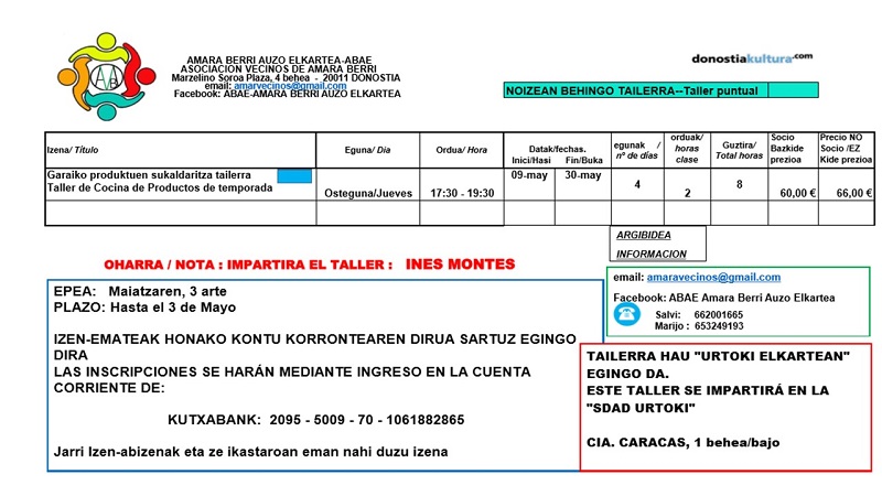 La Asociación de Vecinos de Amara Berri ha organizado un nuevo curso de cocina con productos de temporada que comenzará