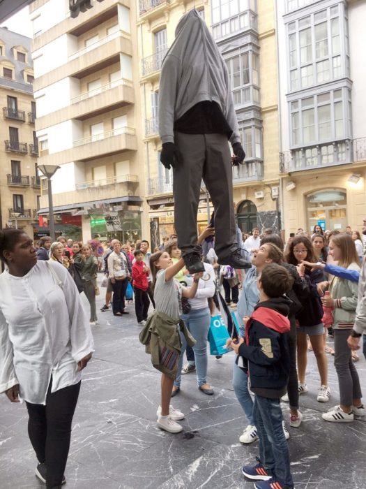 El conocido artista Mark Jenkins ha elegido San Martín para instalar varias de sus obras hiperrealistas y ayer, desde luego, fue la gran atracción del mercado.
