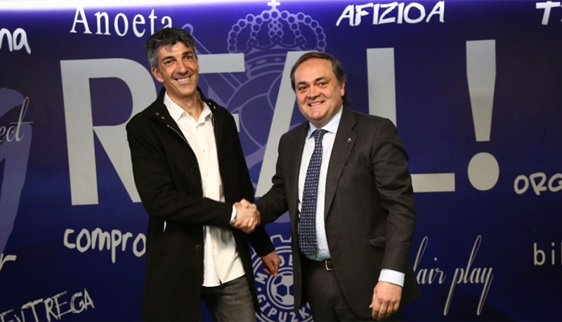 El presidente Jokin Aperribay ha arropado a Imanol Alguacil en su presentación como nuevo técnico del primer equipo txuri urdin.