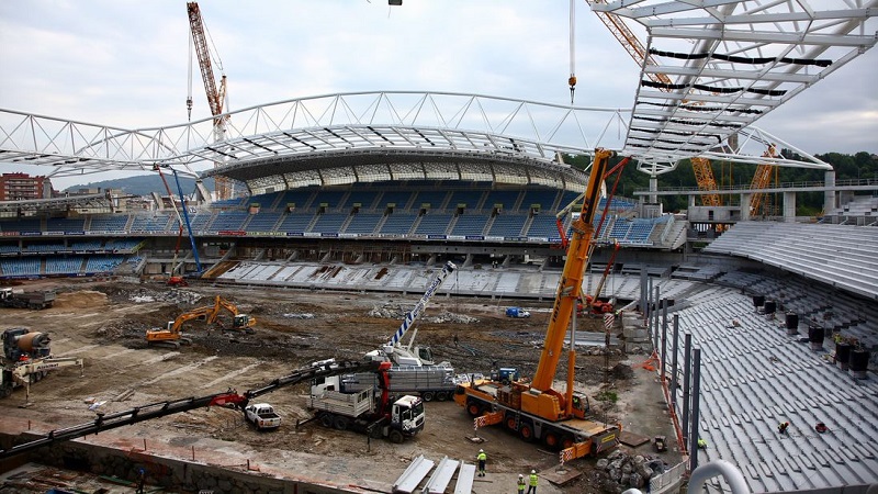 El Futuro Anoeta va cogiendo cada vez más forma. Esta mañana se ha izado la tercera cercha, la de la tribuna este, y durante las próximas horas se procederá a su colocación en la posición definitiva.