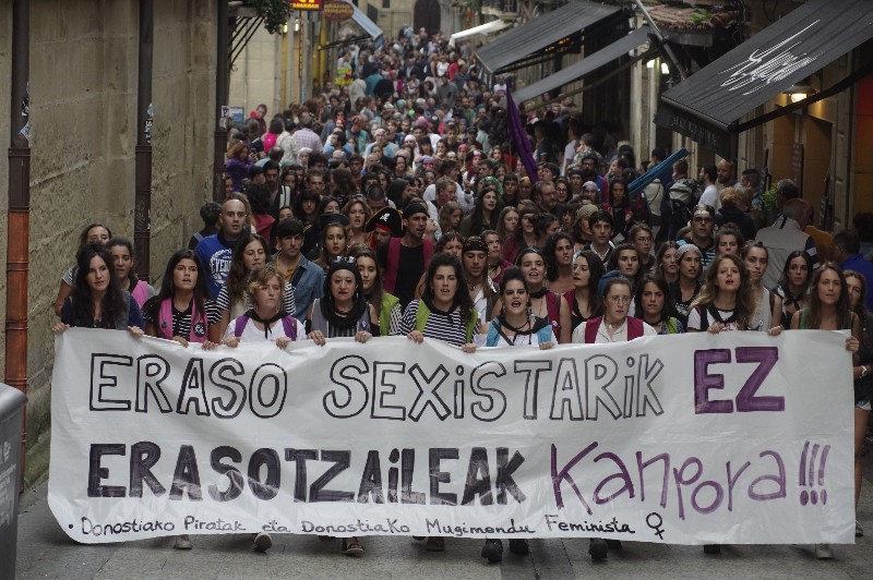 Desde el Boulevard y a lo largo de toda la Parte Vieja miles de donostiarras han recorrido las calles esta tarde para mostrar su repulsa a las agresiones de carácter sexual acontecidas en los últimos días durante las fiestas y muy concretamente a la de esta pasada madrugada, cuando una menor ha denunciado una violación en la playa de la Zurriola. Los dos jóvenes detenidos han pasado a disposición de la Fiscalía de Menores y la Guardia Municipal investiga el caso.