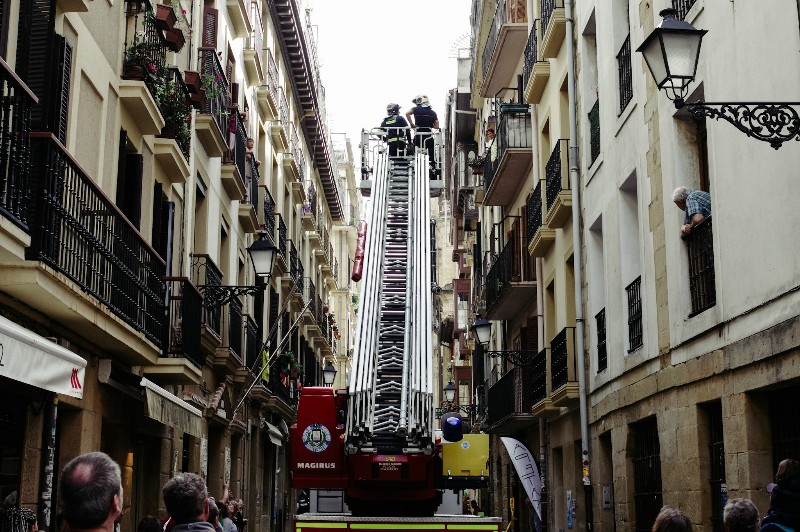 Ante una expectación importante de vecinos y visitantes los bomberos han logrado introducir el camión en la Parte Vieja y han desplegado la escalerilla.