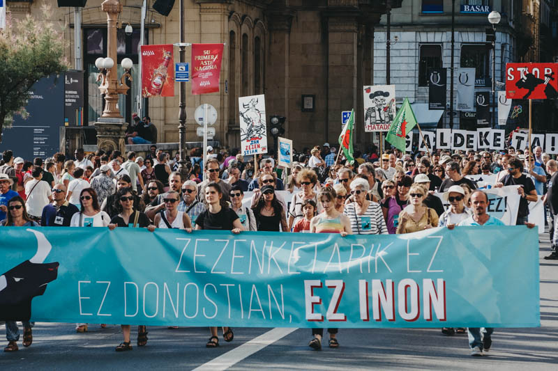 Cientos de personas participaron ayer en la manifestación convocada por Donostia Antitaurina Orain, Eguzki y Askekintza con el eslogan ‘Zezenketarik