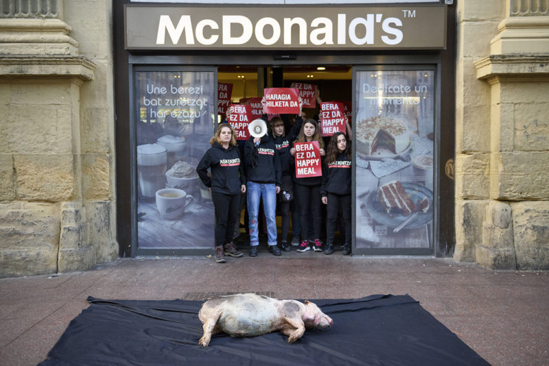 Askekintza bloqueó ayer el McDonald’s del Boulevard donostiarra con el cadáver de un cerdo y coreando los lemas ‘no es