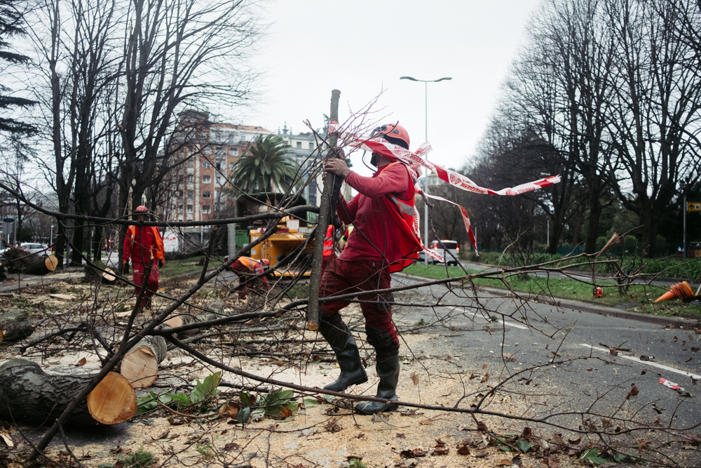 Han caído árboles en Aldakonea, la plaza del Centenario, la Gi-20 (variante), Errondo, Lugaritz,Urbia, Ubegi y Carlos I además del ya citado en Sancho el Sabio con enormes consecuencias en el tráfico.