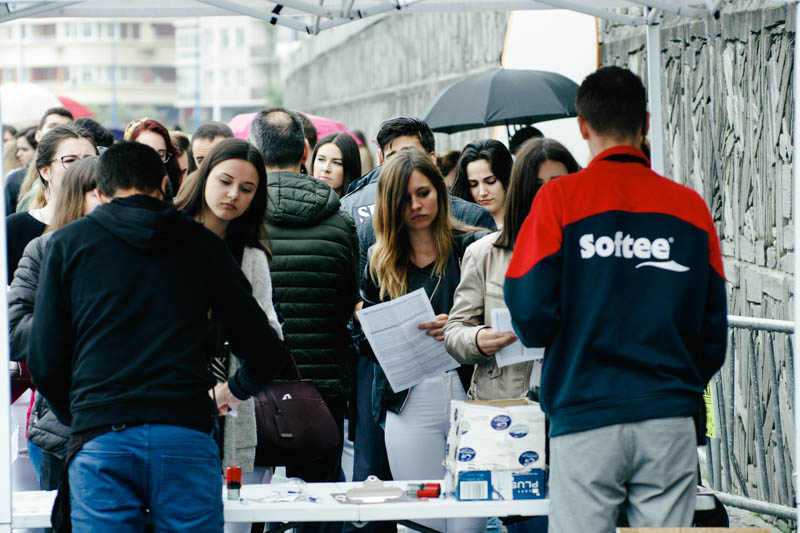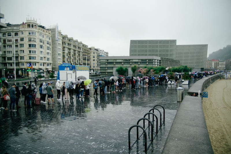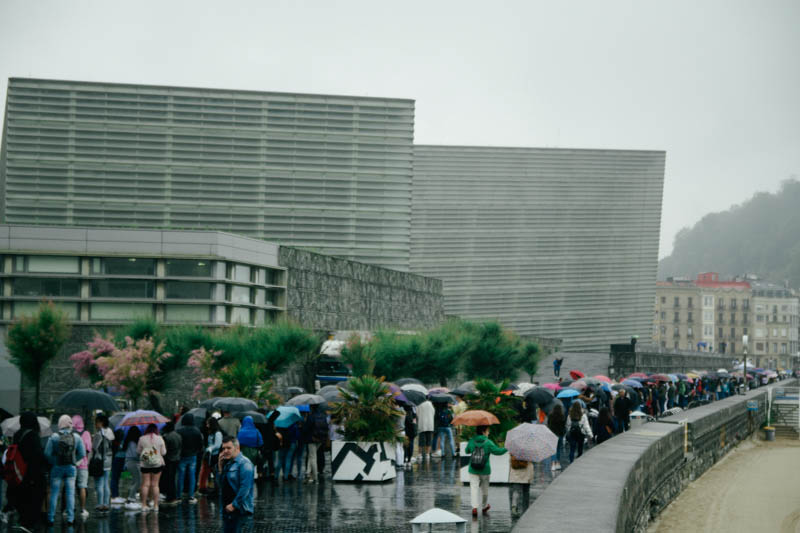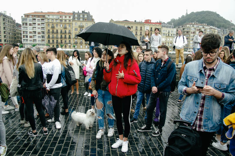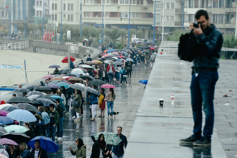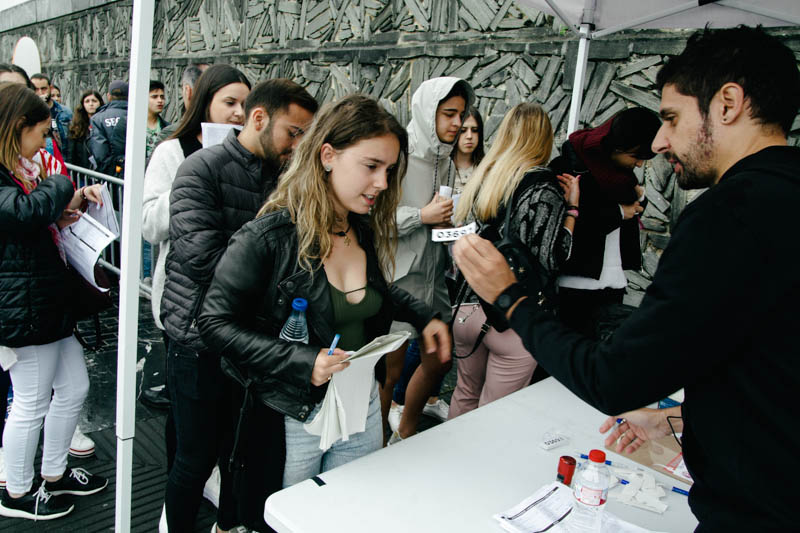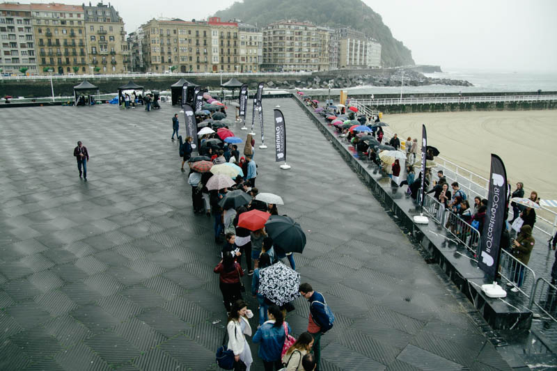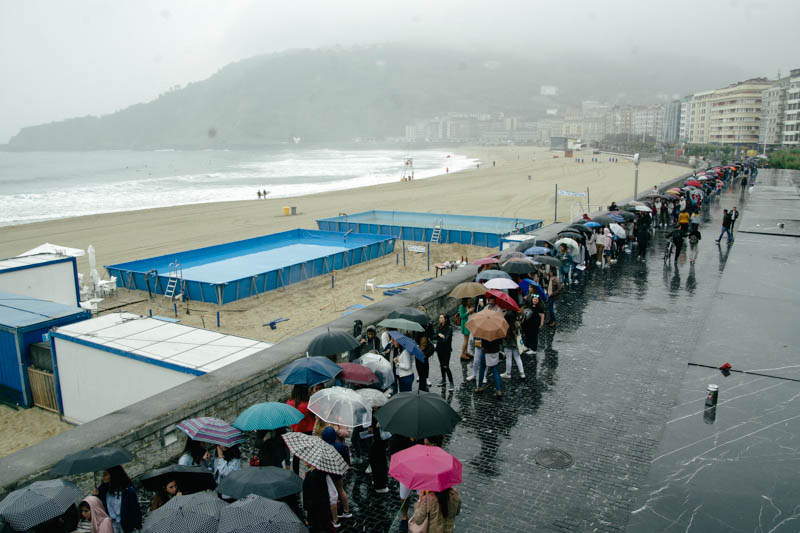 La lluvia no ha desanimado a nadie e, incluso, pese a los nervios, el ambiente era festivo. La hilera de paraguas ha comenzado a formarse desde un buen rato antes de las 10 horas, que es cuando empezaba la prueba. Algunos han querido llegar «con tiempo» para que la espera no se hiciera muy cuesta arriba.
