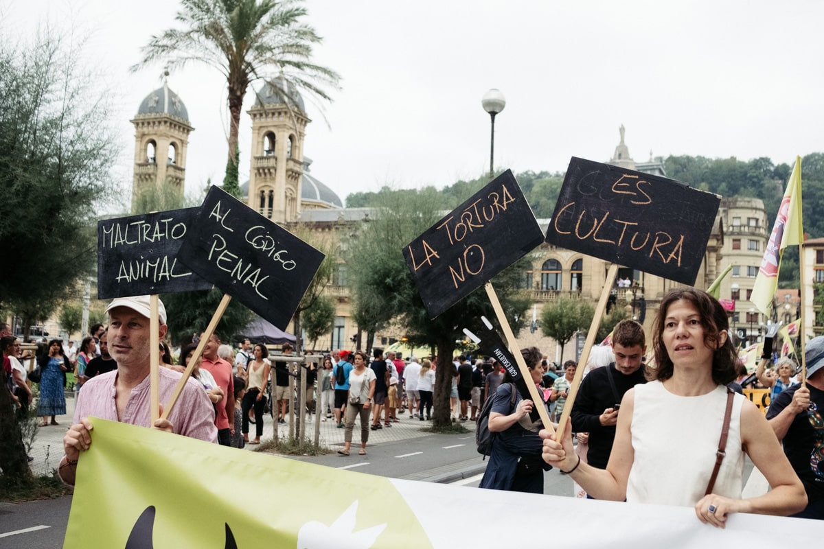 «Goia, escucha, Donostia antitaurina», «Tortura animal, al código penal» o «No es cultura es tortura» fueron algunos de los lemas coreados a lo largo del recorrido por las calles del centro de la ciudad.