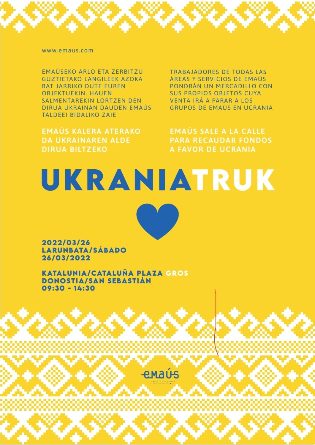 UKRANIAtruk es un mercadillo extraordinario que se celebrará el sábado 26 de marzo en la plaza de Cataluña, de Donostia, donde se pondrán a la venta objetos cotidianos en desuso por parte de personas que trabajan en Emaús Fundación Social en Gipuzkoa en favor de los dos grupos de Emaús que existen en Ucrania, así como de las personas refugiadas del conflicto en Polonia y Rumania.