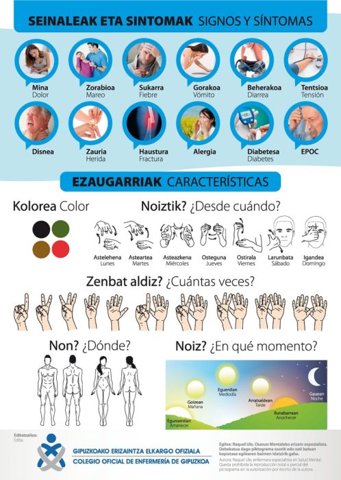 El pictograma recopila algunos signos y síntomas, así como características relativas a la frecuencia, dónde o desde cuándo se presentan. El COEGI lo ha editado en dos formatos: cartel tamaño DINA3 y folleto de mano, y serán distribuidos en los centros sanitarios públicos y privados de Gipuzkoa. Además, cualquier persona interesada en conseguir un ejemplar, puede solicitarlo en el Colegio.