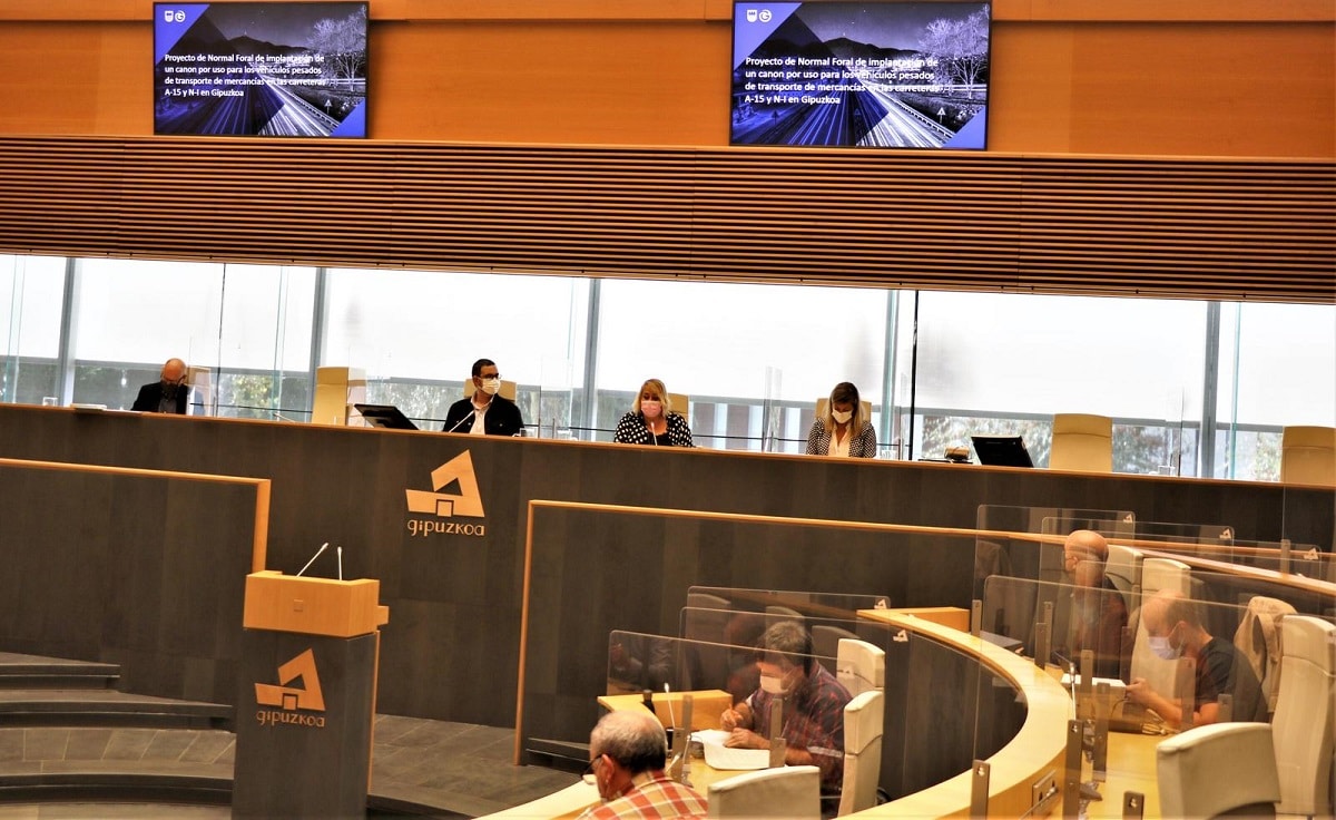 La diputada foral Aintzane Oiarbide ha presentado ante la comisión de Infraestructuras Viarias el anteproyecto de Norma Foral de implantación de un canon por uso para los vehículos pesados de transporte de mercancías en las carreteras A-15 y N-I en Gipuzkoa. Un proyecto que ya ha comenzado su tramitación en las Juntas Generales y donde se debatirá y aprobará antes de que finalice el año. La adecuación de la N-I y de la A-15 al sistema que marca la nueva Norma Foral llevará 12 meses, aproximadamente, por lo que, si todo va según lo previsto, el nuevo sistema entrará en vigor a finales de 2022 o comienzos de 2023.