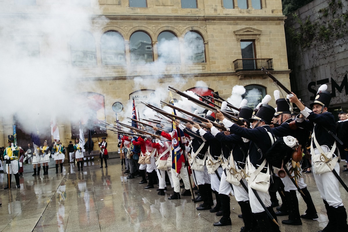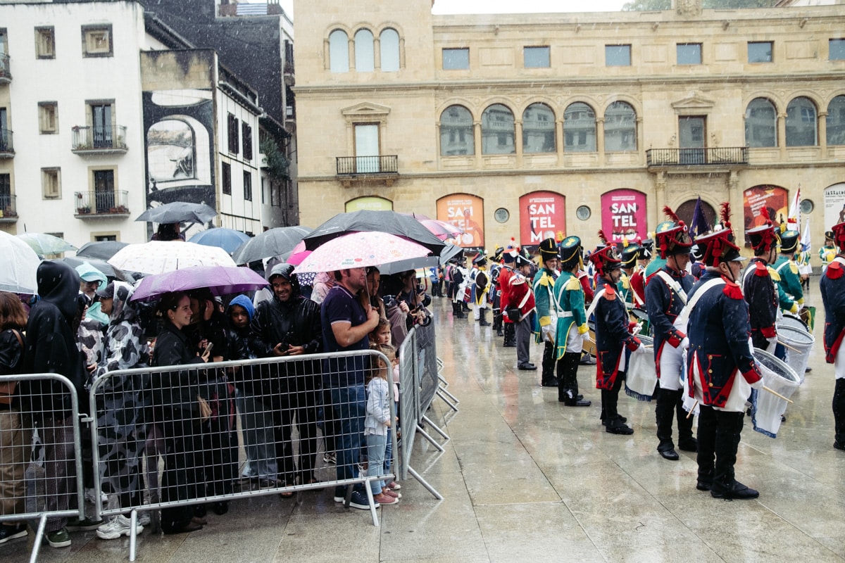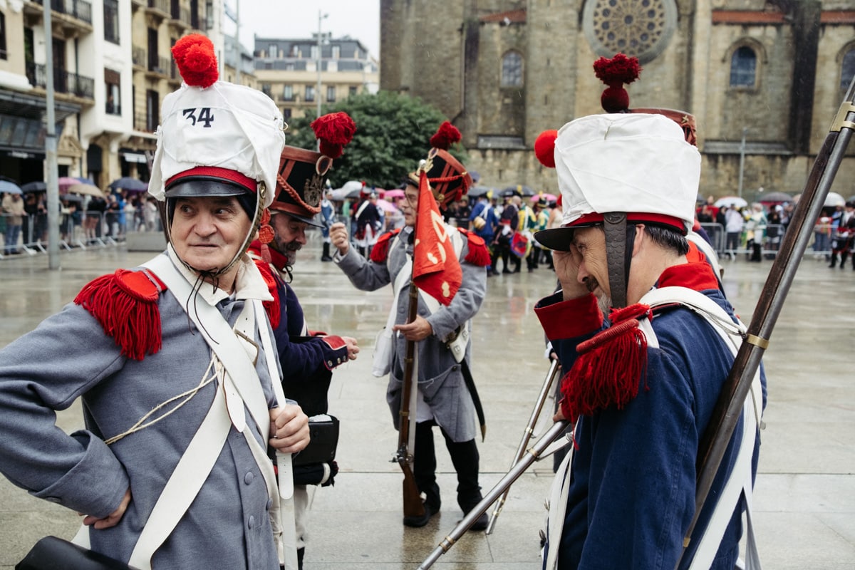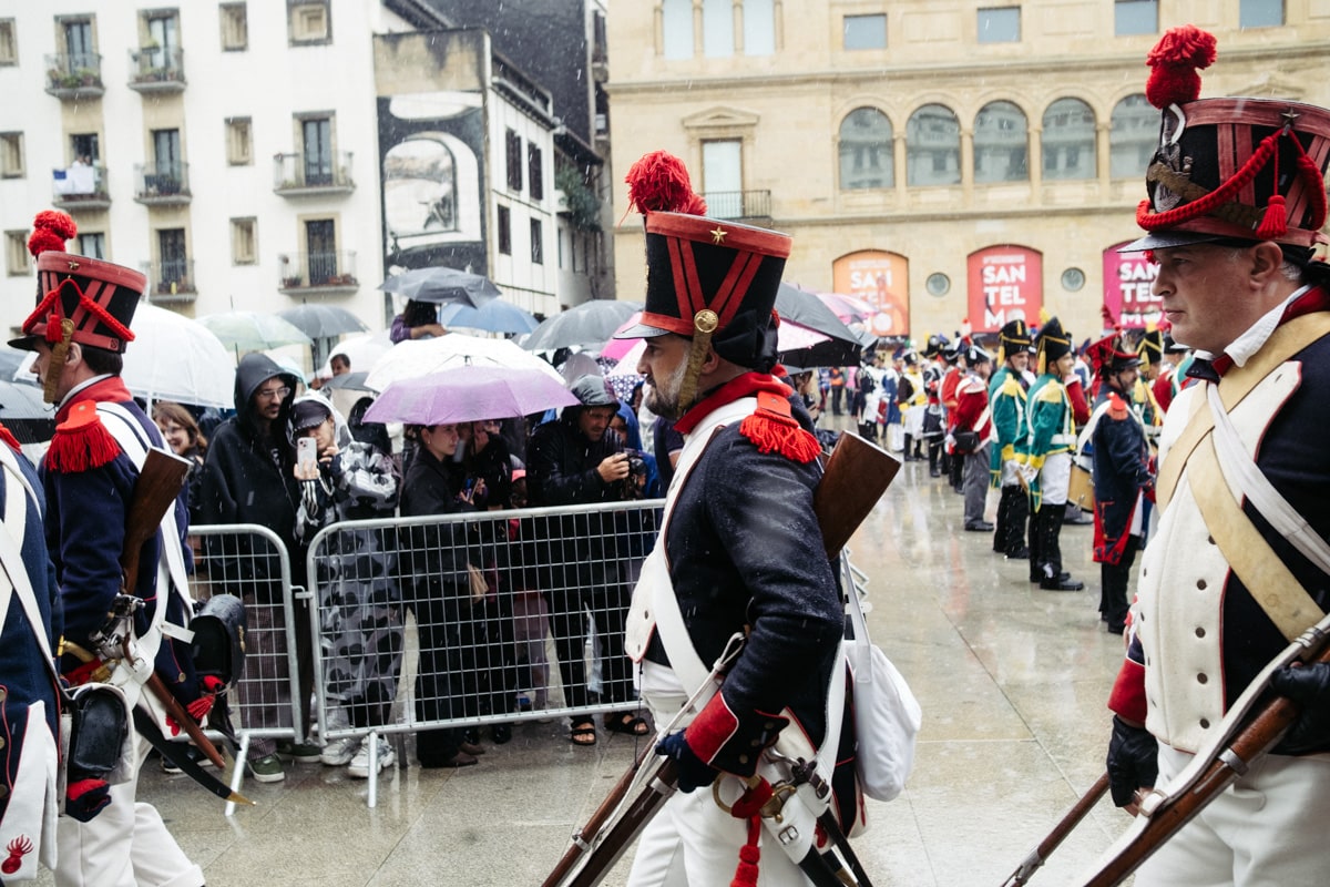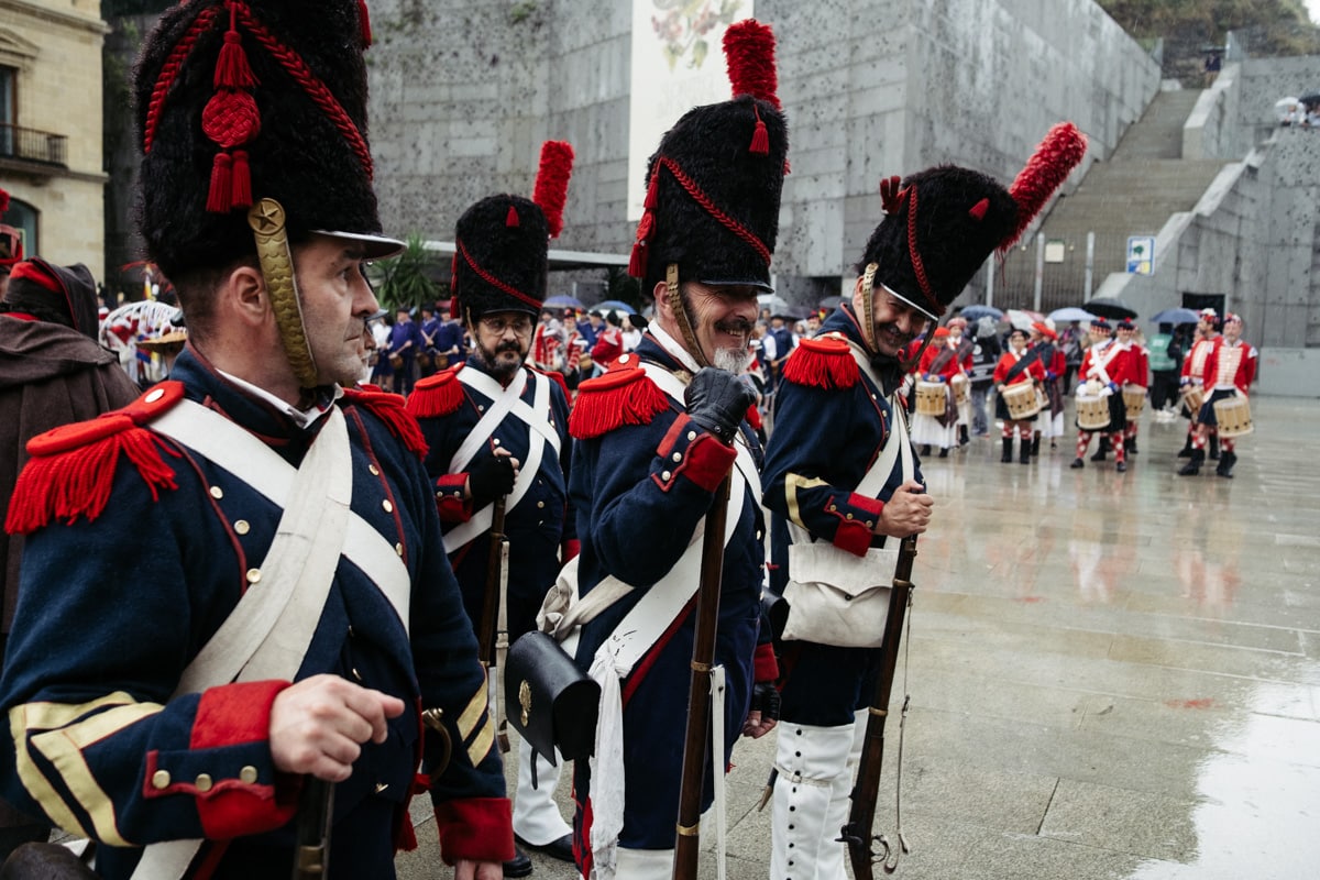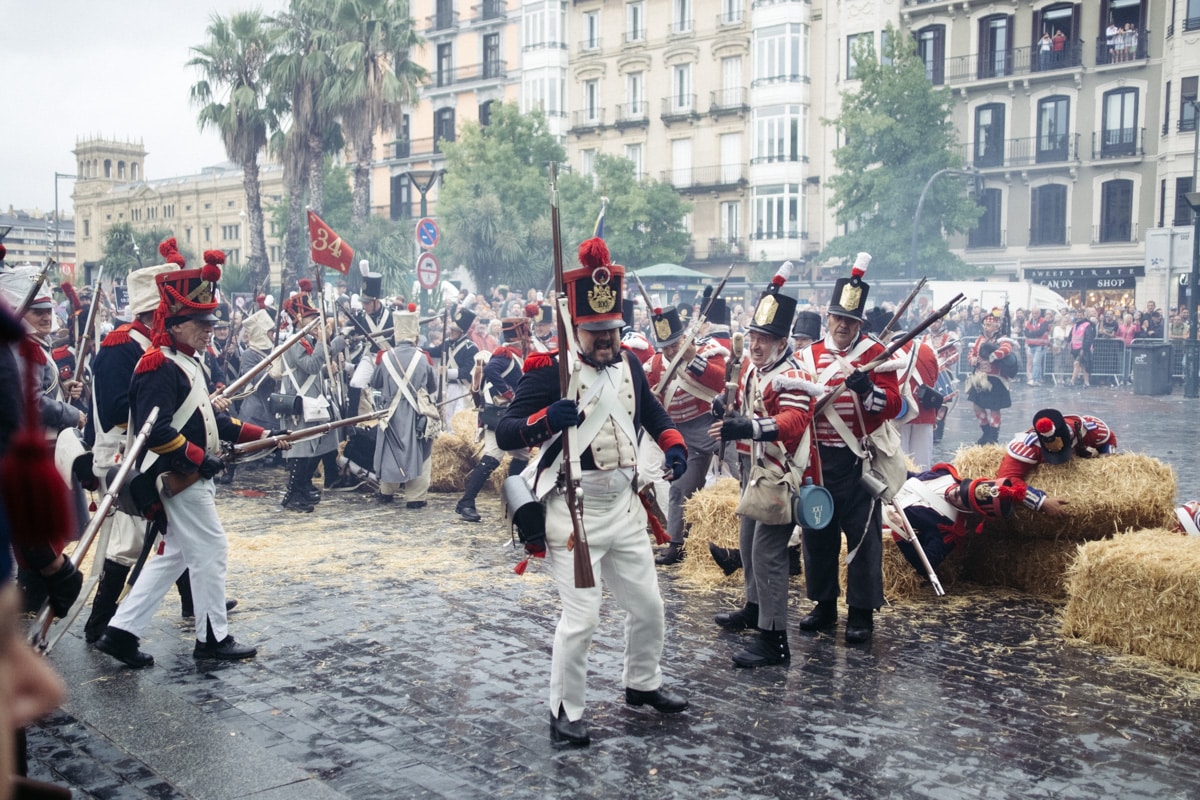 No perdonó la lluvia el pasado año la conmemoración del 31 de Agosto en Donostia y tampoco ha querido faltar hoy. Este domingo no ha podido presentarse más desapacible pese a la buena voluntad de todos los participantes en la recreación del aniversario de la quema de la ciudad en 1813.